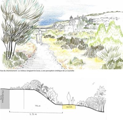 L’objectif est de valoriser le paysage de La Caunette, d’inviter à la découverte du village-rue mais aussi de l’ensemble du territoire du Grand Site. La création d’un cheminement sur la berge Sud de la Cesse permet de diversifier et d’enrichir le maillage piéton en offrant des points de vue sur La Caunette et en redonnant accès aux berges de la Cesse.