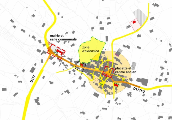 => Le fonctionnement du village s’appuie principalement sur 2 voies départementales qui jouent de fait un rôle structurant. On distingue schématiquement 2 polarités : les abords de la mairie et de la salle communale où se déroulent les fêtes et les manifestations extérieures, et la placette du centre ancien où s’installent les commerçants ambulants. Crédit : CAUE 34