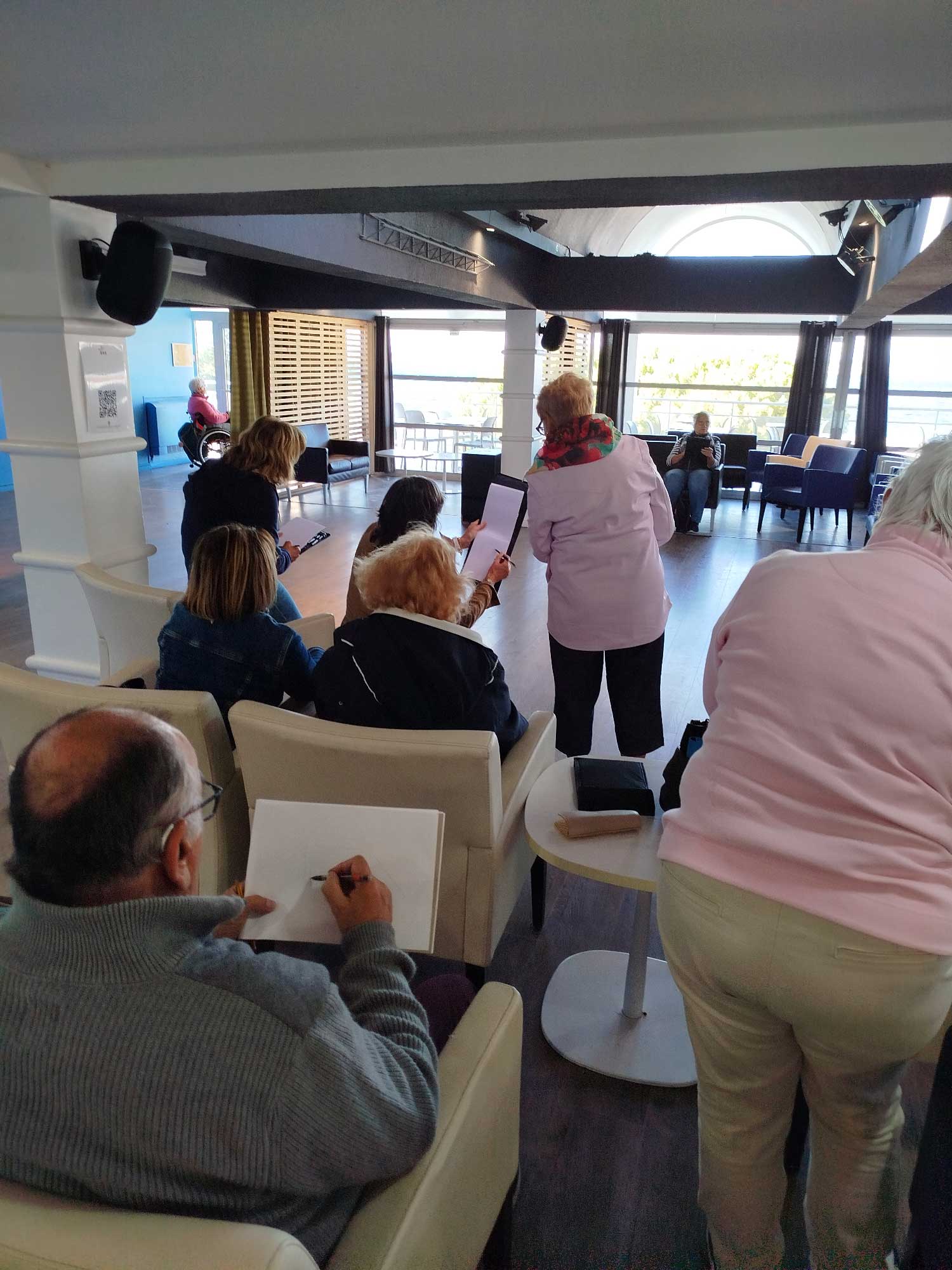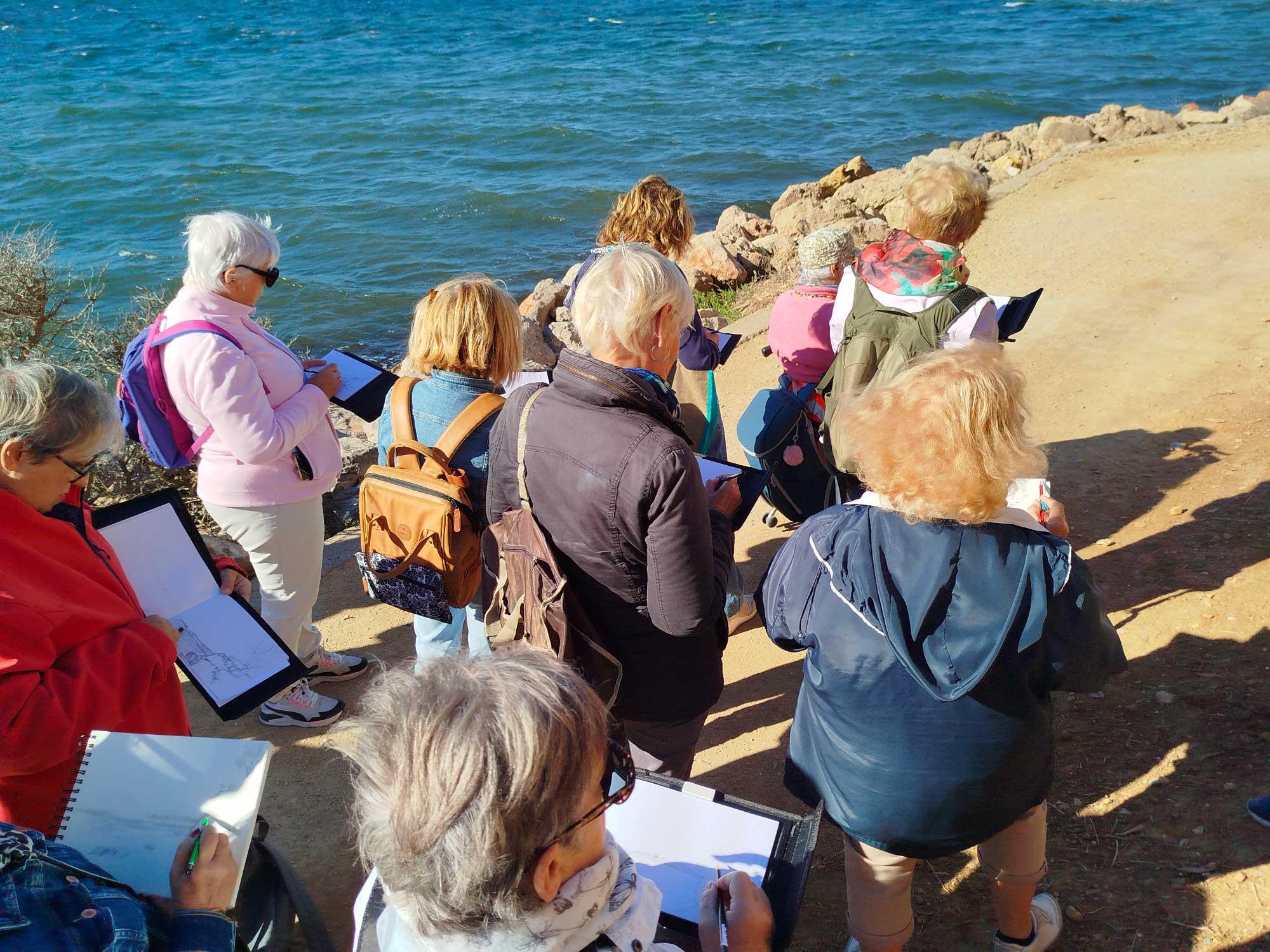 Le jeudi 3 octobre, la déambulation “Balaruc-les-Bains à croquer” a permis à des adhérents d’Art’sociation de s’exercer à la représentation graphique de l’étang et du Belambra (ancien VVF “Les Rives de Thau”, labellisé Architecture contemporaine remarquable, conçu par André Gomis, entre 1969 et 1971), avec les conseils de deux architectes de l’équipe du CAUE. Le temps étant froid et venteux, la séance s’est terminée… dans les fauteuils du salon du Belambra ! Cette situation a permis aux participants de s’exercer à représenter en perspective les voûtains de cette architecture typique du début des années 1970… exercice particulièrement difficile !