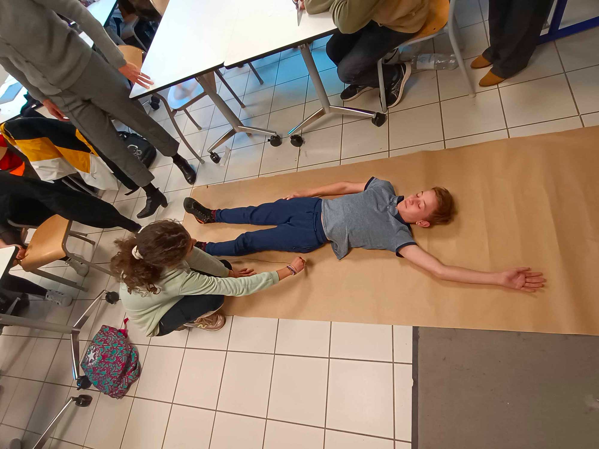 - Gare aux chatouilles ! Une élève dessine les contours de la silhouette de Gwenaël.