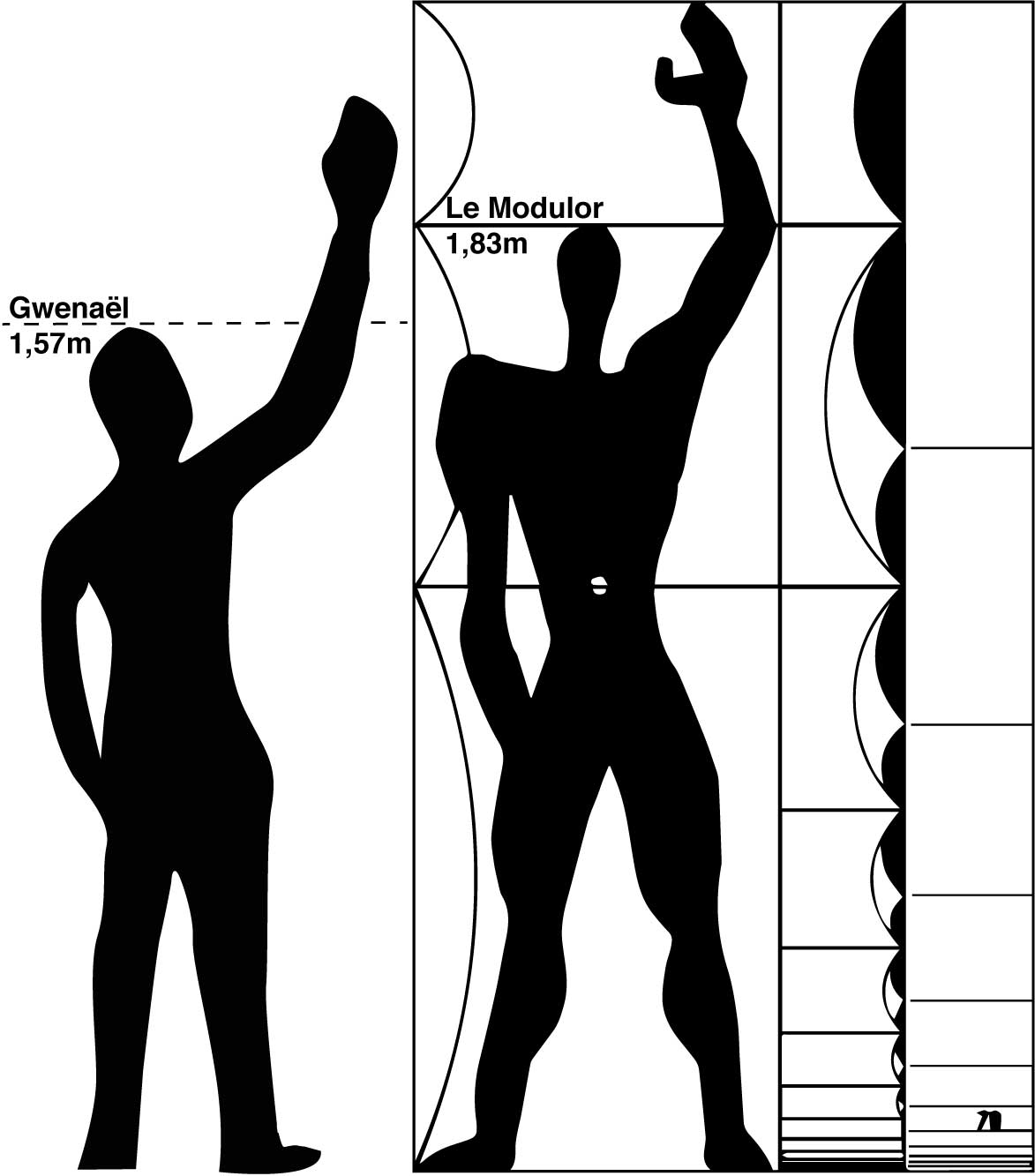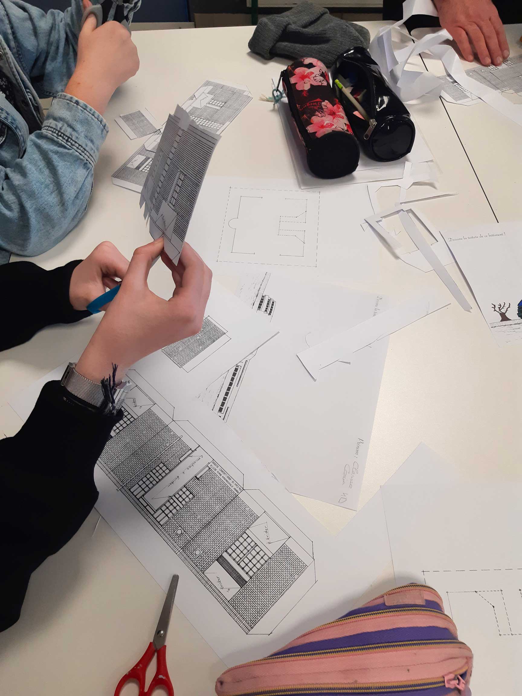 Les élèves ont été invités à se lancer dans la création architecturale en imaginant la volumétrie de la toiture de l’un des plus célèbres bâtiments du XXe s. : l’opéra de Sydney ! Pour aborder la question des mesures et proportions, un Modulor grandeur humaine leur a été présentée (silhouette humaine standardisée conçue par Le Corbusier, pour lui permettre de concevoir la taille de ses unités d’habitation), ce Modulor dont Einstein disait “C’est un langage de proportions qui rend compliqué le mal et simple le bien“. Cette silhouette a été comparée à la silhouette d’un élève de la classe, Gwenaël, pour bien se familiariser avec cette question des mesures et proportions. En fin de séance, c’est la question des représentations d’un bâtiment par les architectes qui a été développée (vues en plan, façades, coupes, maquettes). Afin de bien comprendre le passage de la représentation en deux dimensions à celle d’un volume 3D, les élèves se sont lancés, en fin de séance, dans la fabrication d’une maquette de maison.