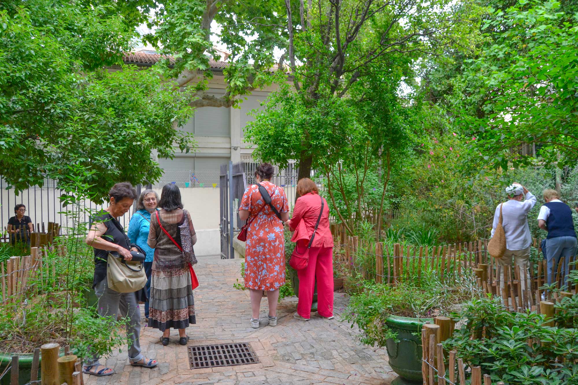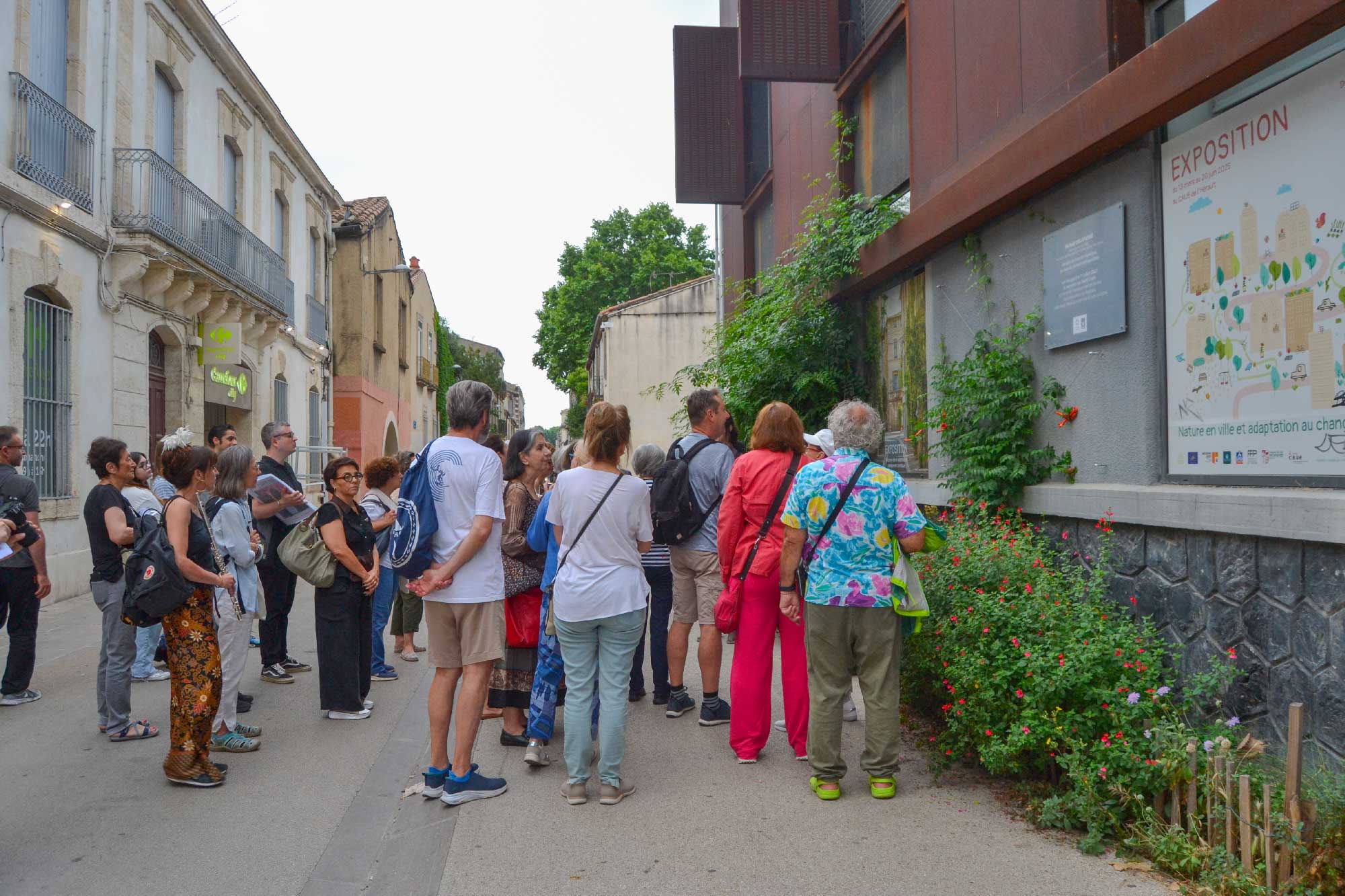 En guise d’introduction à la balade, le public découvre l’exposition “Nature en ville et changement climatique“. Les paysagistes du CAUE réunissent ensuite le groupe dans la cour : le premier jardin de la balade. Ce patio urbain et végétalisé est embaumé par les fleurs du jasmin étoilé et celles du faux-poivrier pleureur. Il s’agit d’un ancien centre vaccinal vétérinaire construit dans les années 1930. Aujourd’hui, c’est un refuge pour la biodiversité, qui s’exprime dans la végétation foisonnante des plantes grimpantes, des bananiers, des plantes vivaces… Depuis cette année, le CAUE est également devenu refuge LPO (Ligue de Protection des Oiseaux) et bénéficie de l’installation de nichoirs.