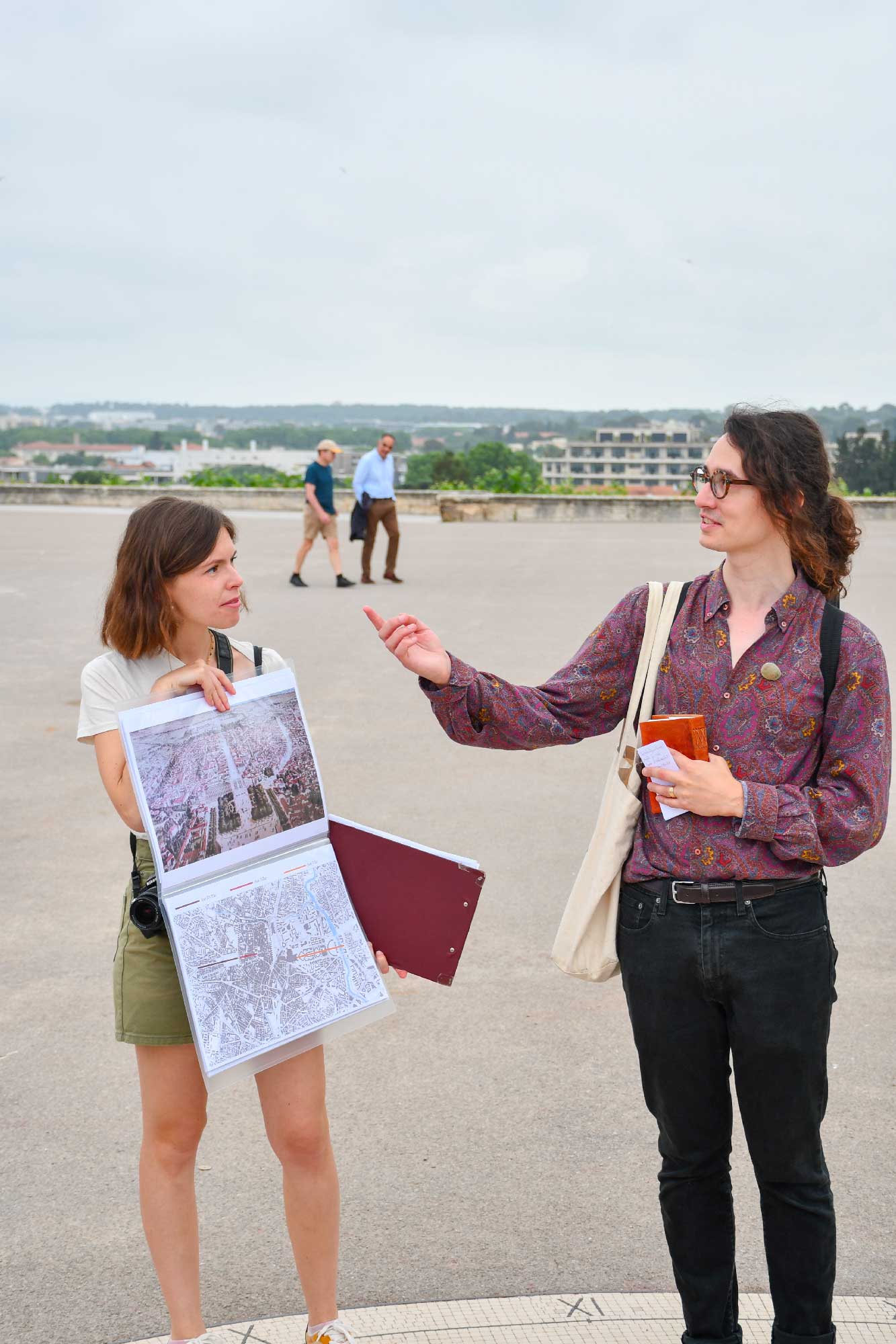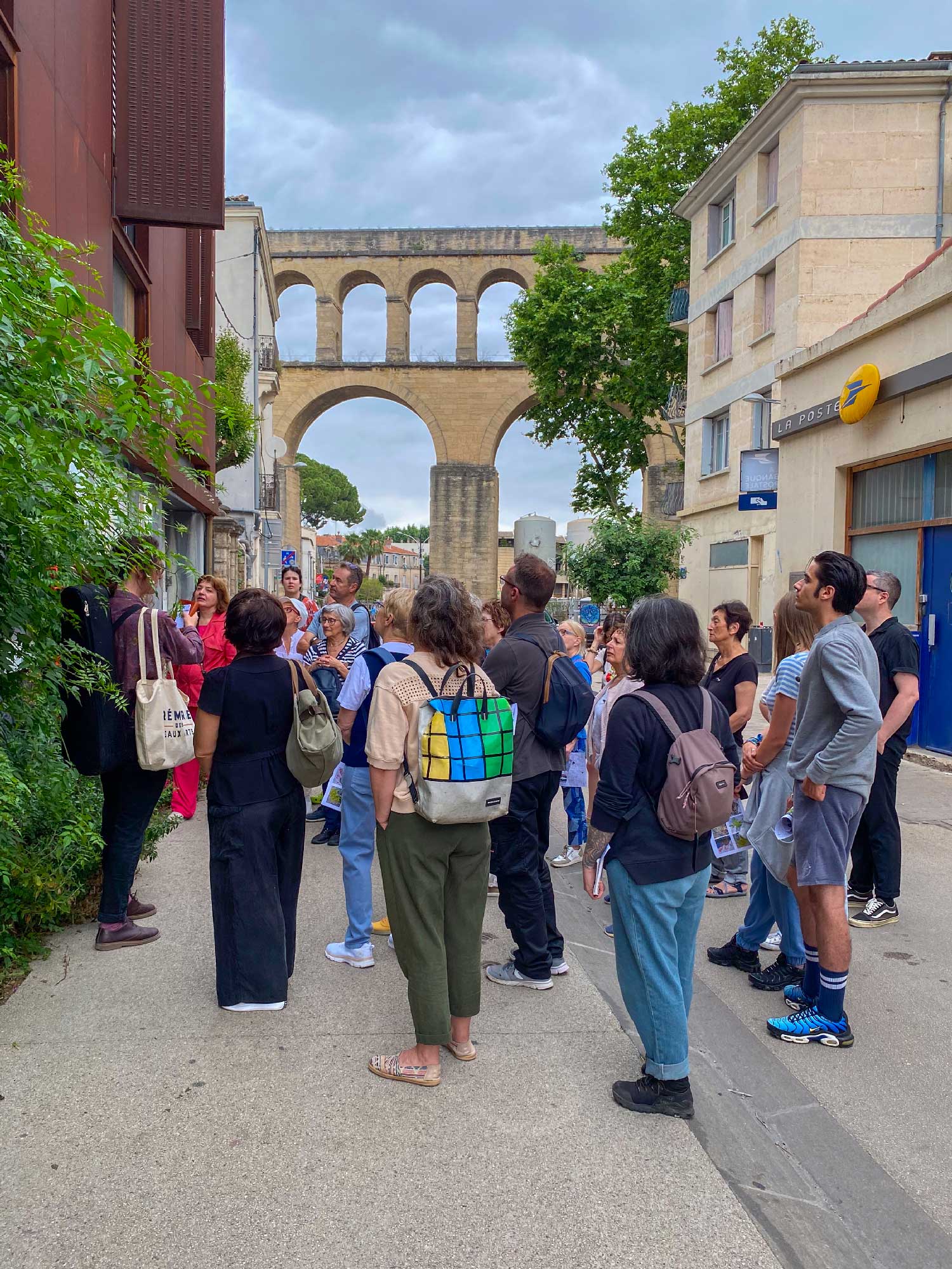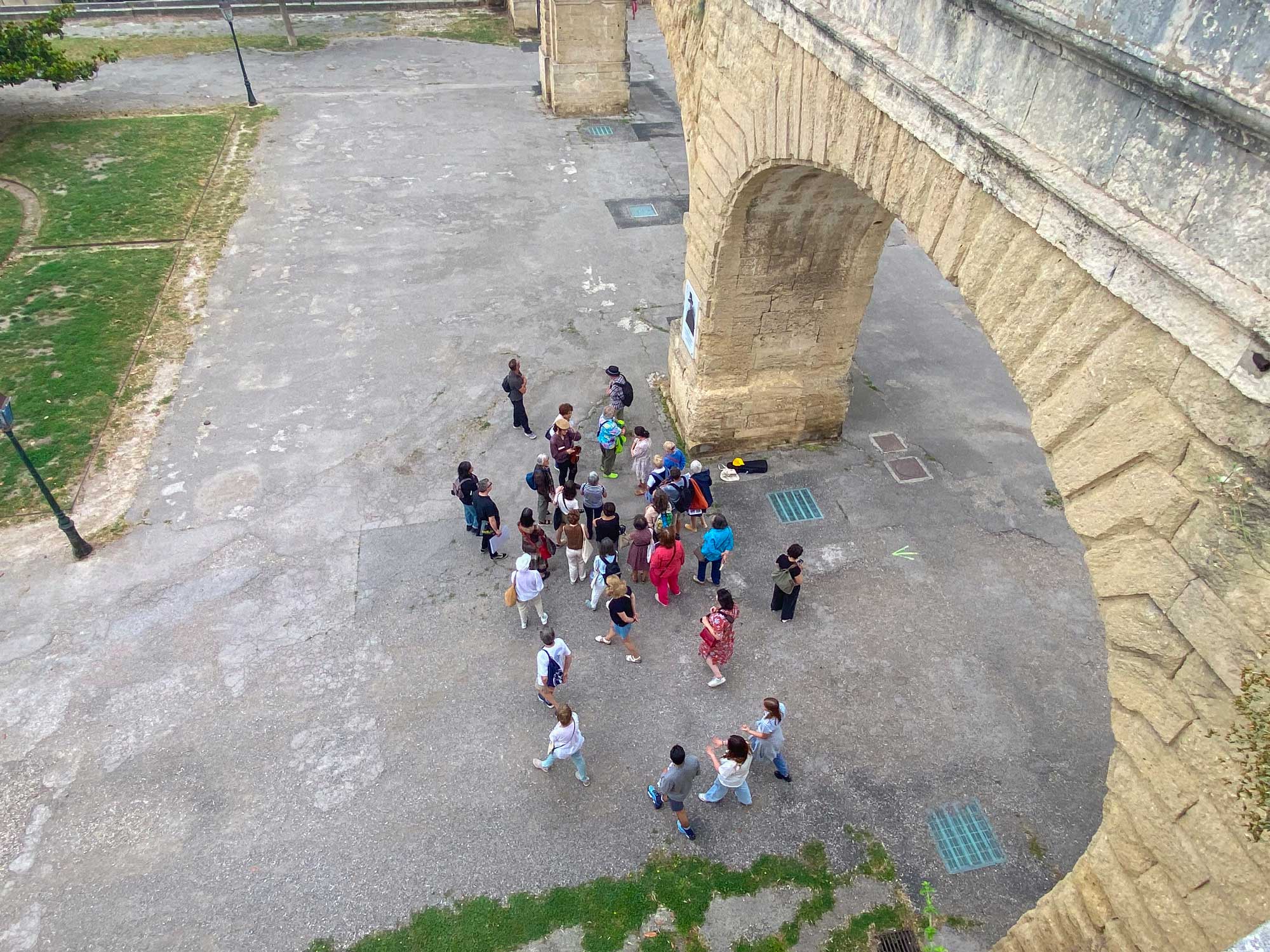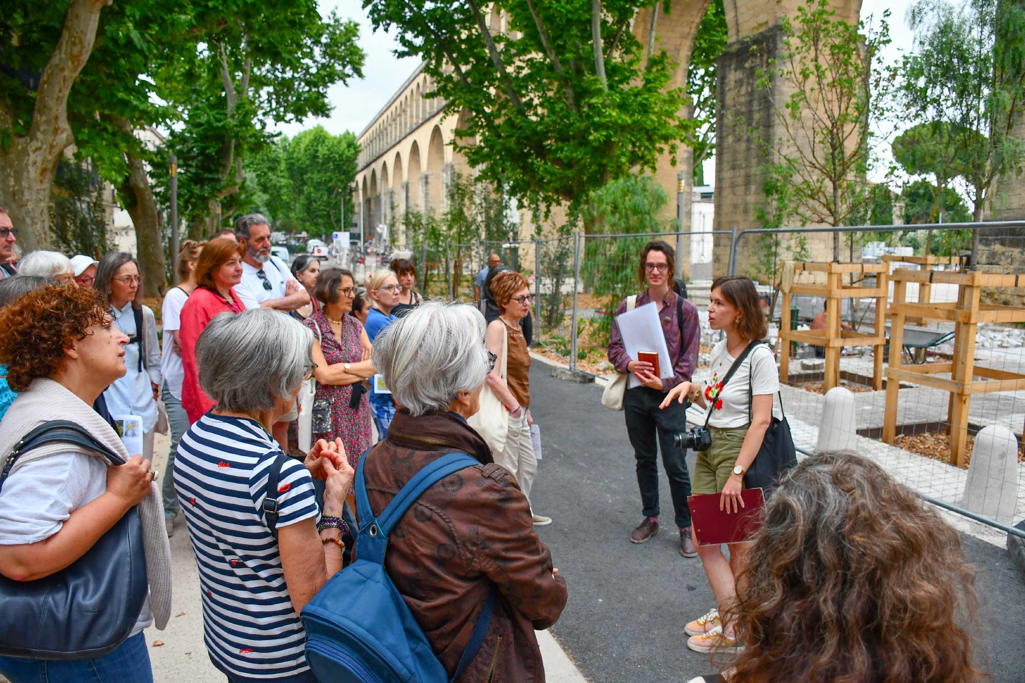 Un arrêt sous l’aqueduc du XVIIIe siècle permet aux participants d’imaginer les usages passés du quartier des “Arceaux” : jeu de tambourin, foire aux ânes et aux bestiaux, parking … et bientôt une place désimperméabilisée et végétalisée ! Là encore, la pierre est au rendez-vous : le calcaire coquillier du monument mais aussi les pavés flambant neufs, en cours d’installation par les artisans.