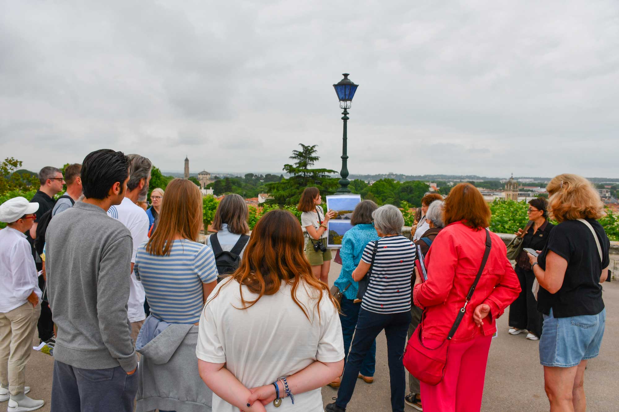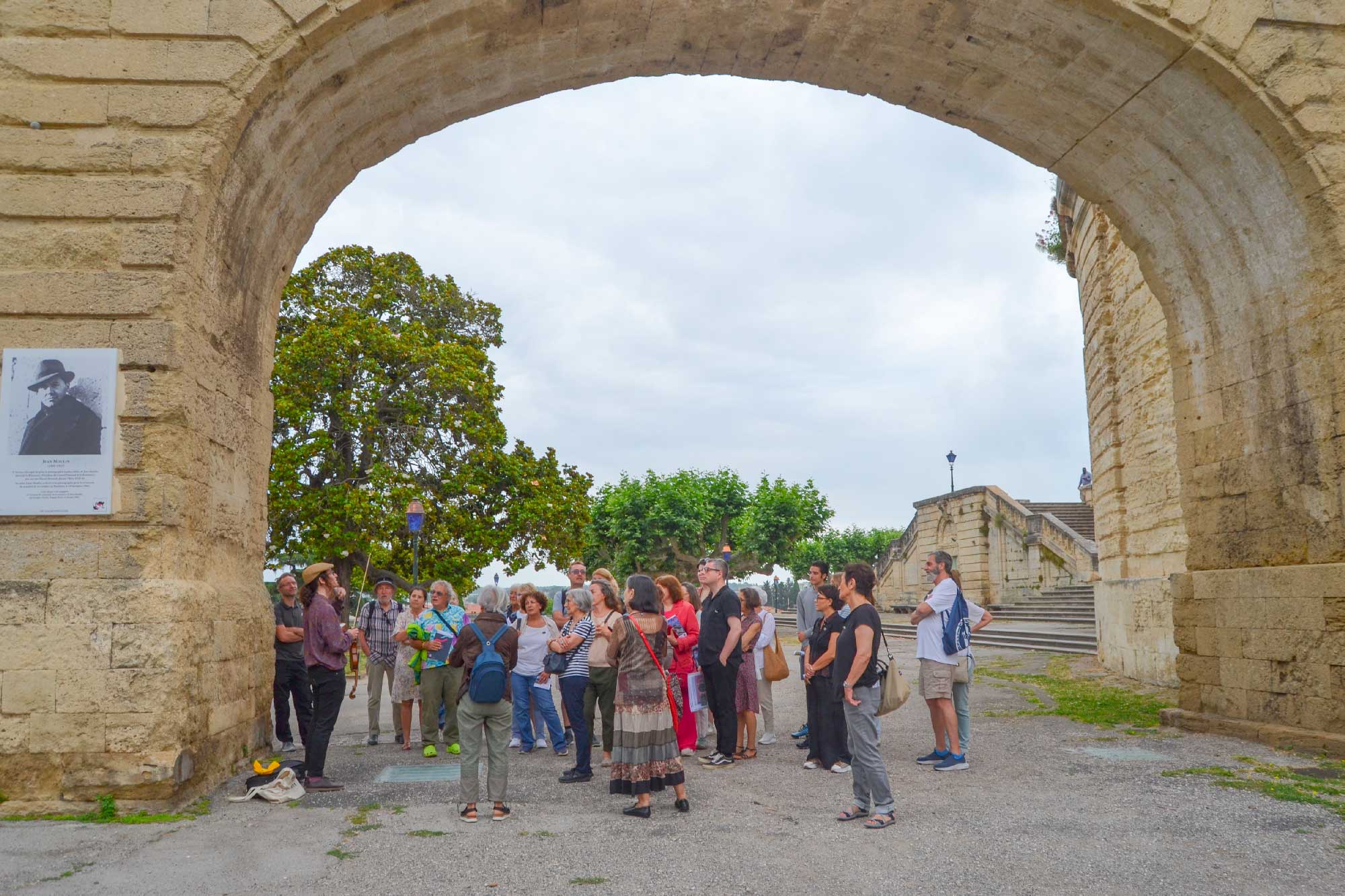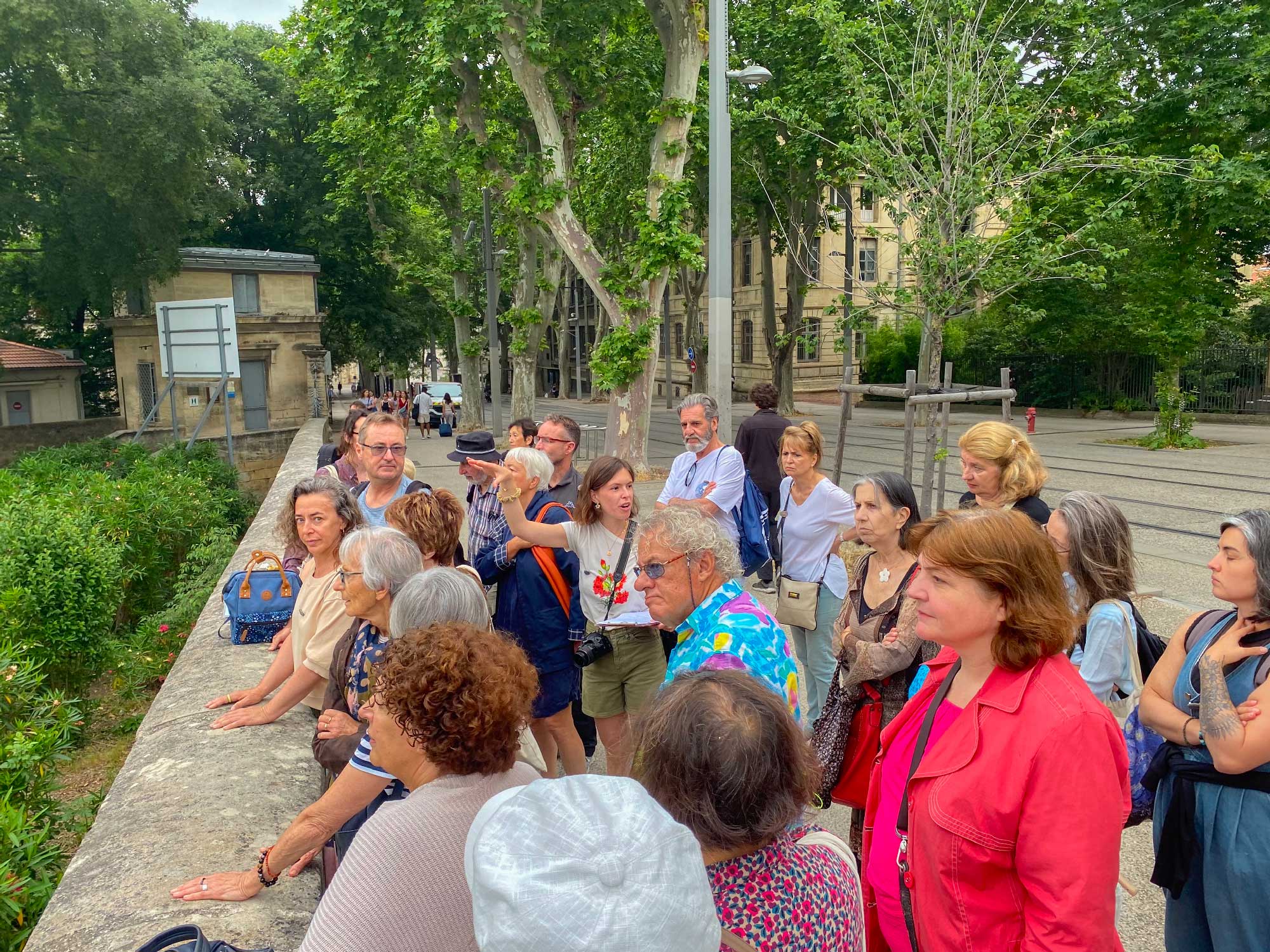 En descendant le boulevard Henri IV, le groupe bénéficie d’une vue plongeante sur le magnifique Jardin des plantes. Les paysagistes racontent son histoire et attirent l’attention sur les nouvelles plantations d’arbres réalisées le long des rails de tramway. Dans l’alignement des cyprès, se dresse enfin la tour des pins. Cette tour, vestige des anciens remparts de la ville de Montpellier, est l’une des deux encore debout sur les 25 construites. Ce monument de pierre prend place dans un jardin, telle une ruine pittoresque.