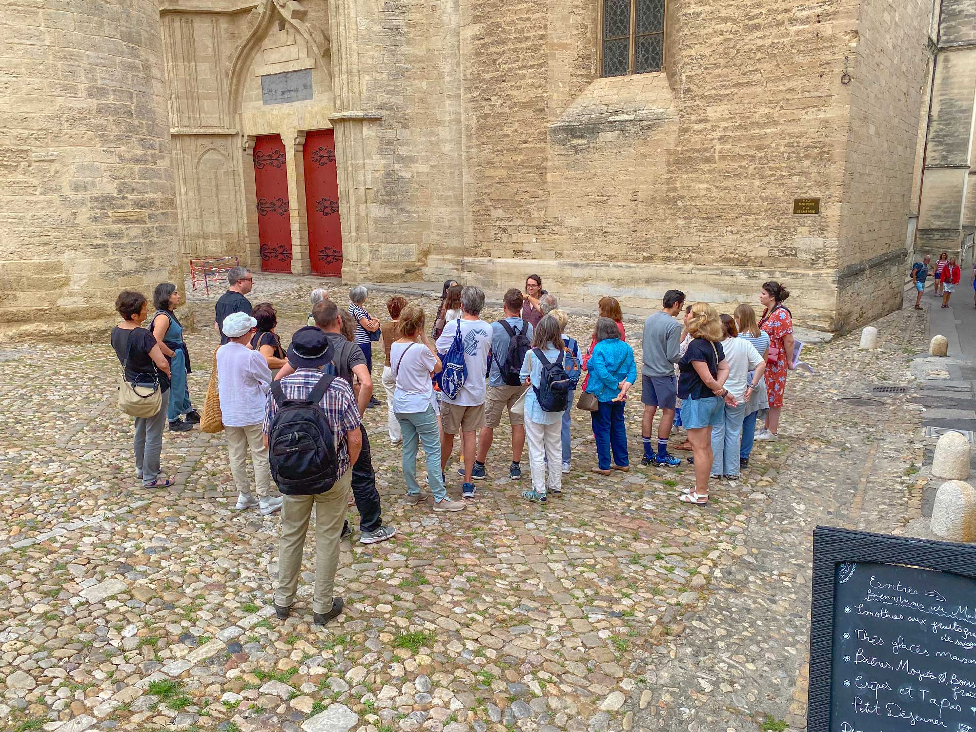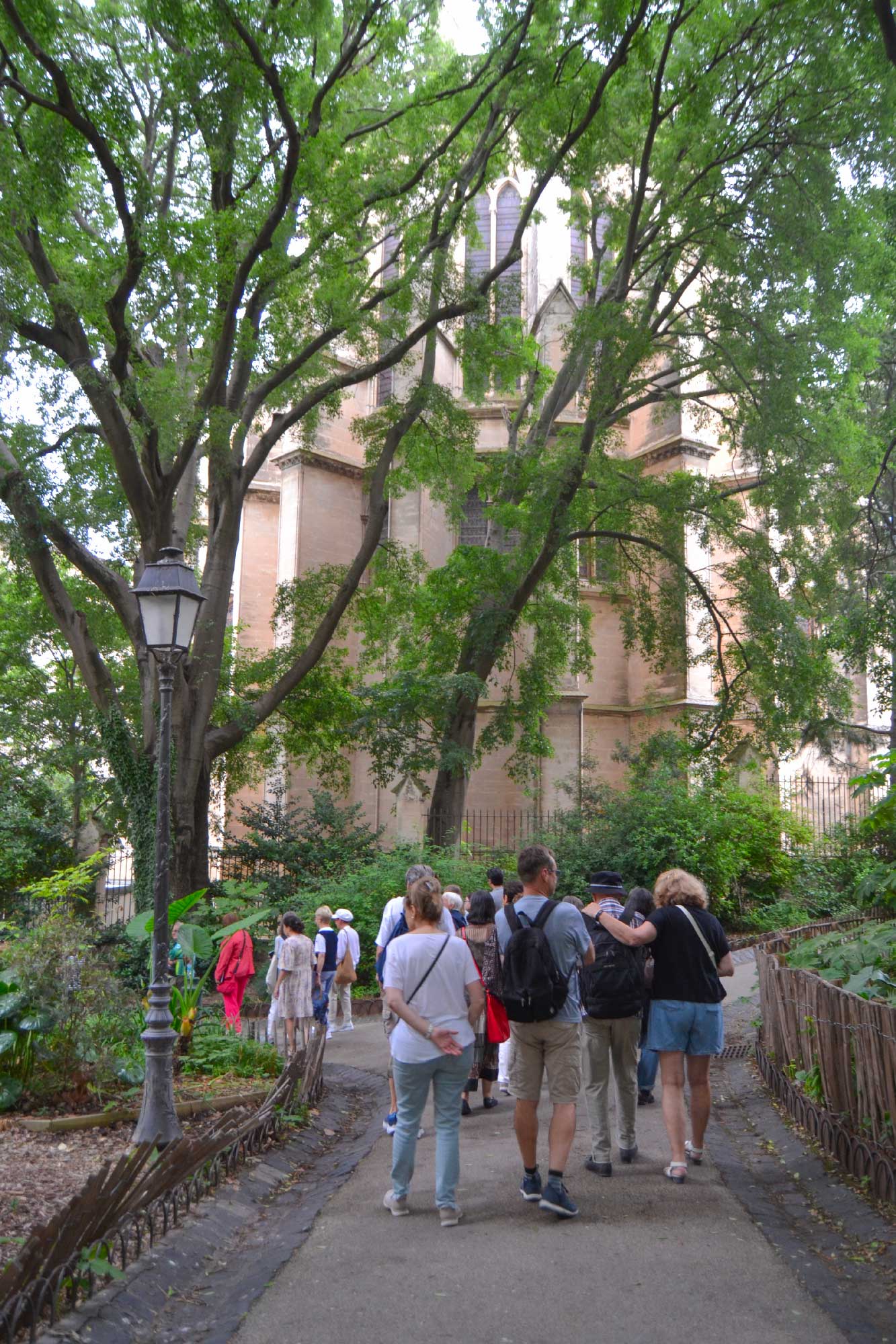 En chemin, le groupe continue d’observer la végétation logée entre les pierres : il admire cette fois la grande calade du parvis de la cathédrale Saint-Pierre (près de 1 000 m2). Si la monumentale cathédrale est célèbre, elle se trouve parfaitement mise en valeur par les dessins de ce jardin à fleur de pierres.