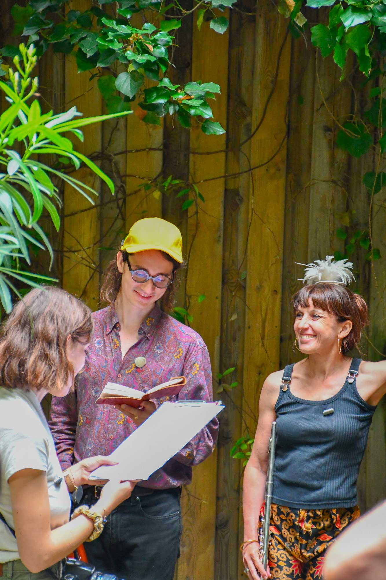 Tout a coup, un chant mélodieux se fait entendre et le conte commence : c’est l’Oiseau 🐦⬛ le meilleur ami de Pierre (Valérie, à la flûte traversière perchée à l’étage). S’il est habituellement joyeux, l’Oiseau alerte rapidement le public : Pierre a disparu ! Le groupe accepte de venir en aide à l’Oiseau et part à la recherche de son ami au jardin du Peyrou.