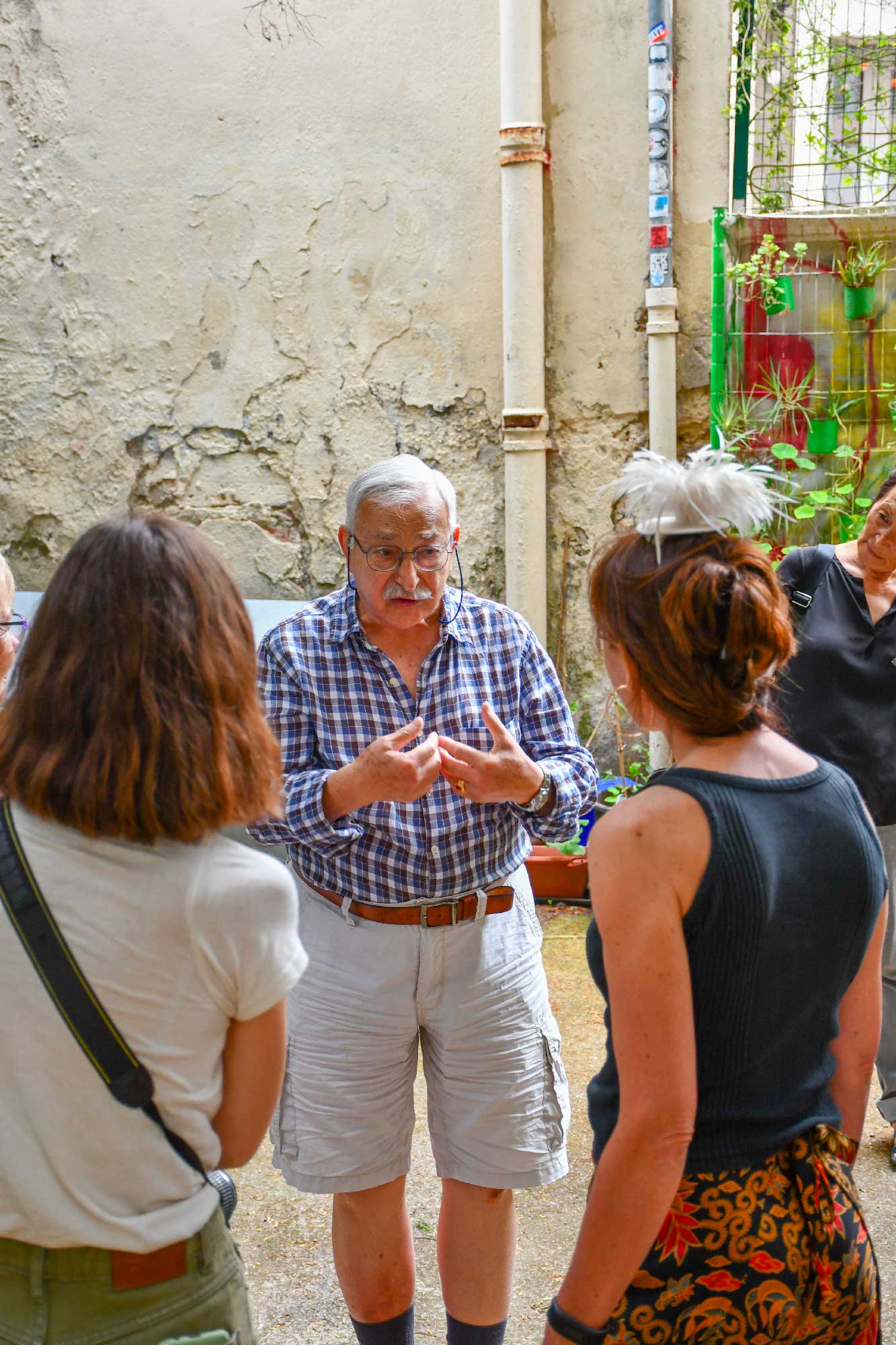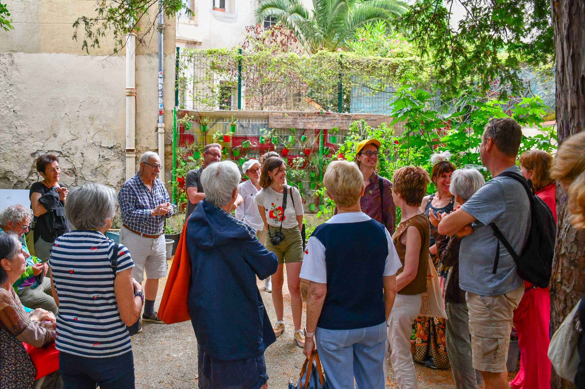 La balade se termine sur la terrasse haute du jardin de l’Intendance du Languedoc : un espace géré par l’association “Les amoureux de Candolle”. Ce jardin partagé mais secret, est riche d’une belle collection de plantes aromatiques cultivées et entretenues “avec amour” par les habitants du quartier. Sous l’ombre protectrice du grand if et d’un magnifique arbre de Judée aux branches noueuses, les participants échangent une dernière fois avec les paysagistes et les membres de l’association ; ils en tirent de l’inspiration pour leurs propres espaces extérieurs domestiques, partagent des astuces et des anecdotes… avant de repartir la tête pleine de jardins parfumés, harmonieux, musicaux et… ornés de belles pierres 🪨🌿.