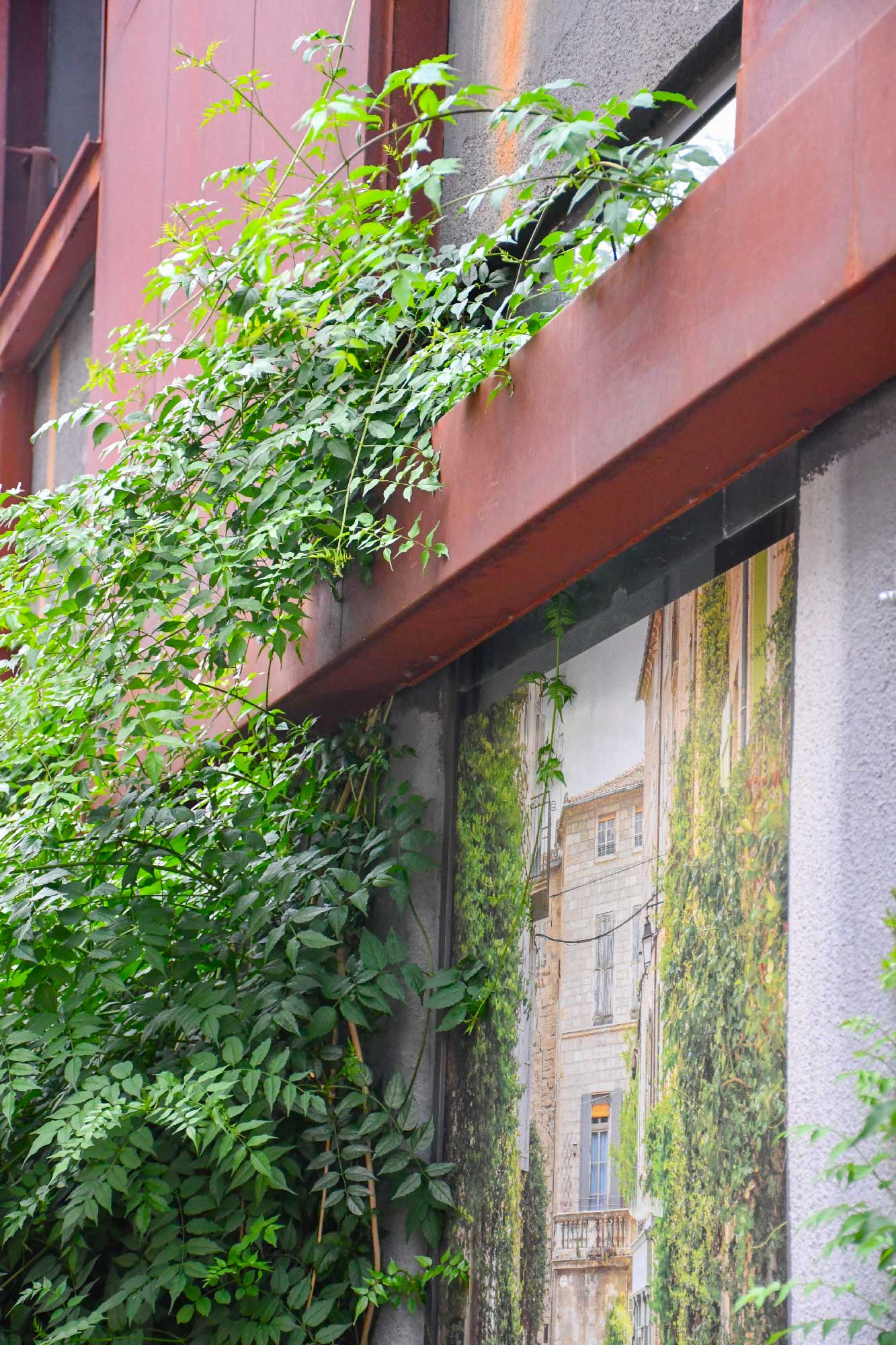 En sortant du CAUE, le groupe s’arrête devant la façade du bâtiment. Des plantes vivaces et grimpantes ont été installées au pied de l’immeuble depuis l’automne 2023. Les paysagistes détaillent cette méthode simple et vertueuse de végétaliser nos villes et d’y introduire davantage de nature. C’est aussi l’occasion d’observer le soubassement de l’édifice en pierres hexagonales, qui met en valeur la grande diversité des feuillages (près de trente espèces différentes !).