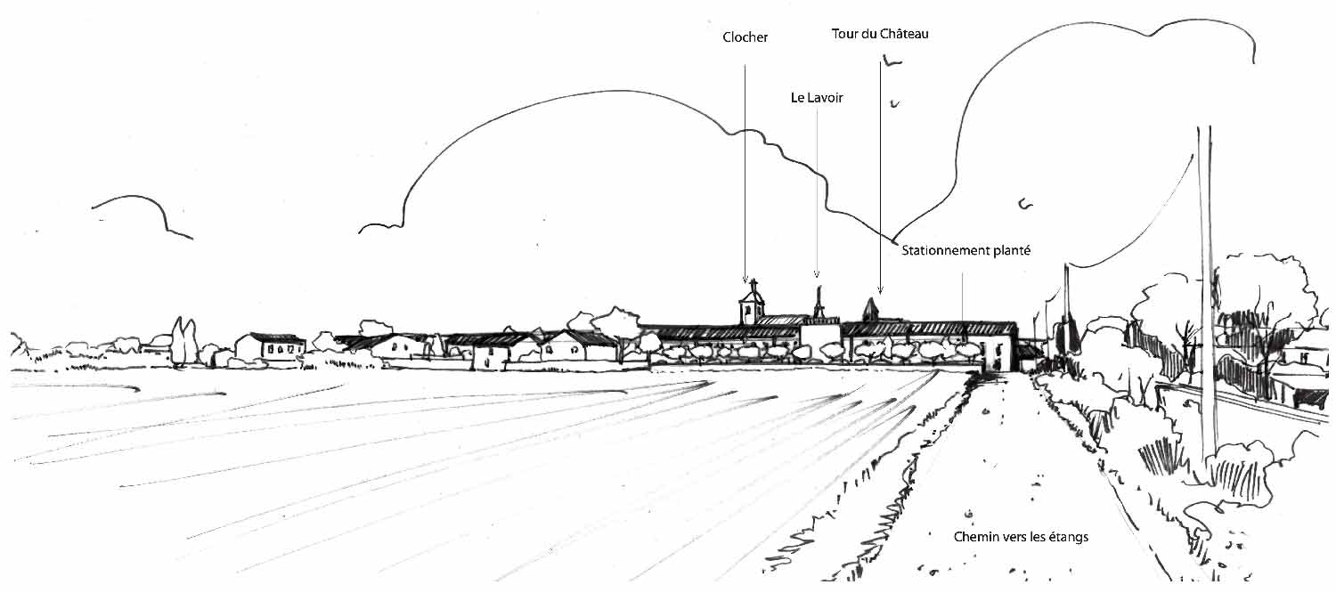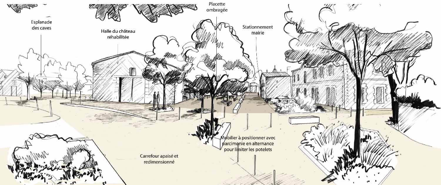 L’équipe propose une gestion globale du stationnement pour la piétonnisation des places et ruelles du centre ancien, du parvis de l’école, la mise en sens unique des avenues adjacentes au centre ancien pour un apaisement de la circulation et un recalibrage de la voirie au profit des modes de déplacements doux. Un zoom sur le centre ancien permet d’identifier le potentiel de renouvellement du bâti vacant, que ce soit pour les maisons de village, comme pour les granges agricoles dont le devenir pose question. Des préconisations sont édictées pour la requalification de sites en déshérence comme le canal de l’Or et l’ancien port, ou encore la plaine des sports.