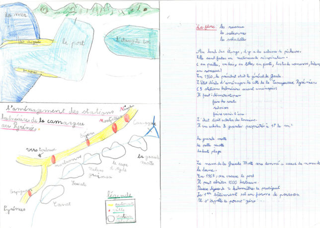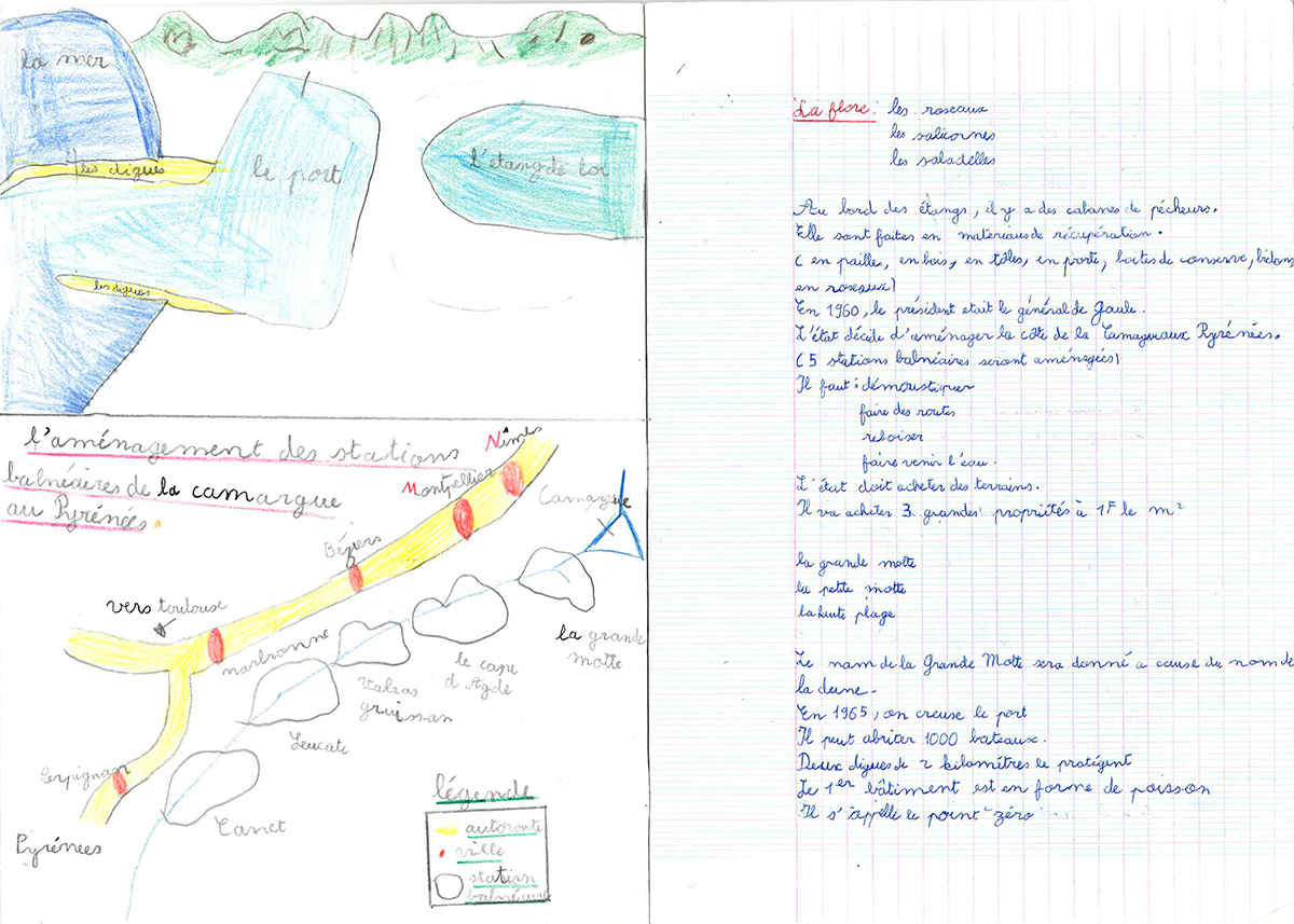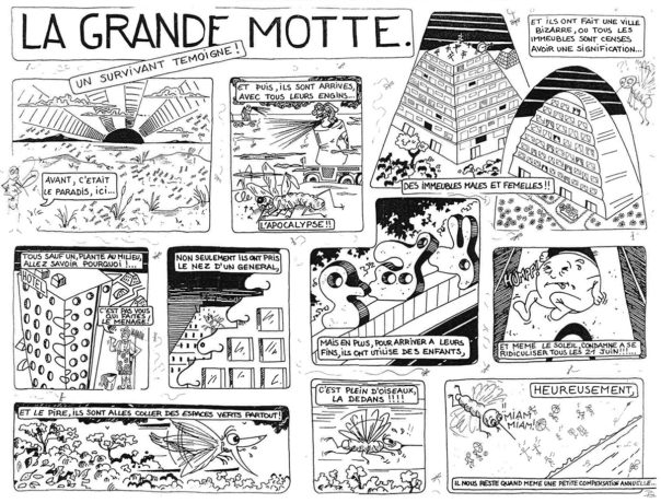 Depuis de nombreuses années, le CAUE s’intéresse à la Grande-Motte. La naissance d’une ville sur le territoire héraultais dans le cadre de l’aménagement du littoral du Languedoc-Roussillon pousse à la curiosité.Durant l’année scolaire 1991-92, nous avons animé un atelier de sensibilisation auprès d’une classe de CE2 de l’école Lamartine à Montpellier et d’une classe de première A3 du lycée Jean Monnet à Montpellier, et de leurs enseignantes : Myriam Sirven, institutrice, et Simone Cauquil, professeur d’arts plastiques. Plusieurs visites de la ville et surtout la rencontre avec Jean Balladur, architecte en chef, et ses collaborateurs, ont inspiré ces écoliers et lycéens qui ont réalisé dessins, cartes et plans, bandes dessinés pour exprimer leur vision de la ville. L’ouvrage La Grande-Motte, cité des dunes, publié en 1994, a été nourri de ces découvertes et rencontres. Nous partageons ici quelques photos et quelques réalisations d’élèves de l’époque.