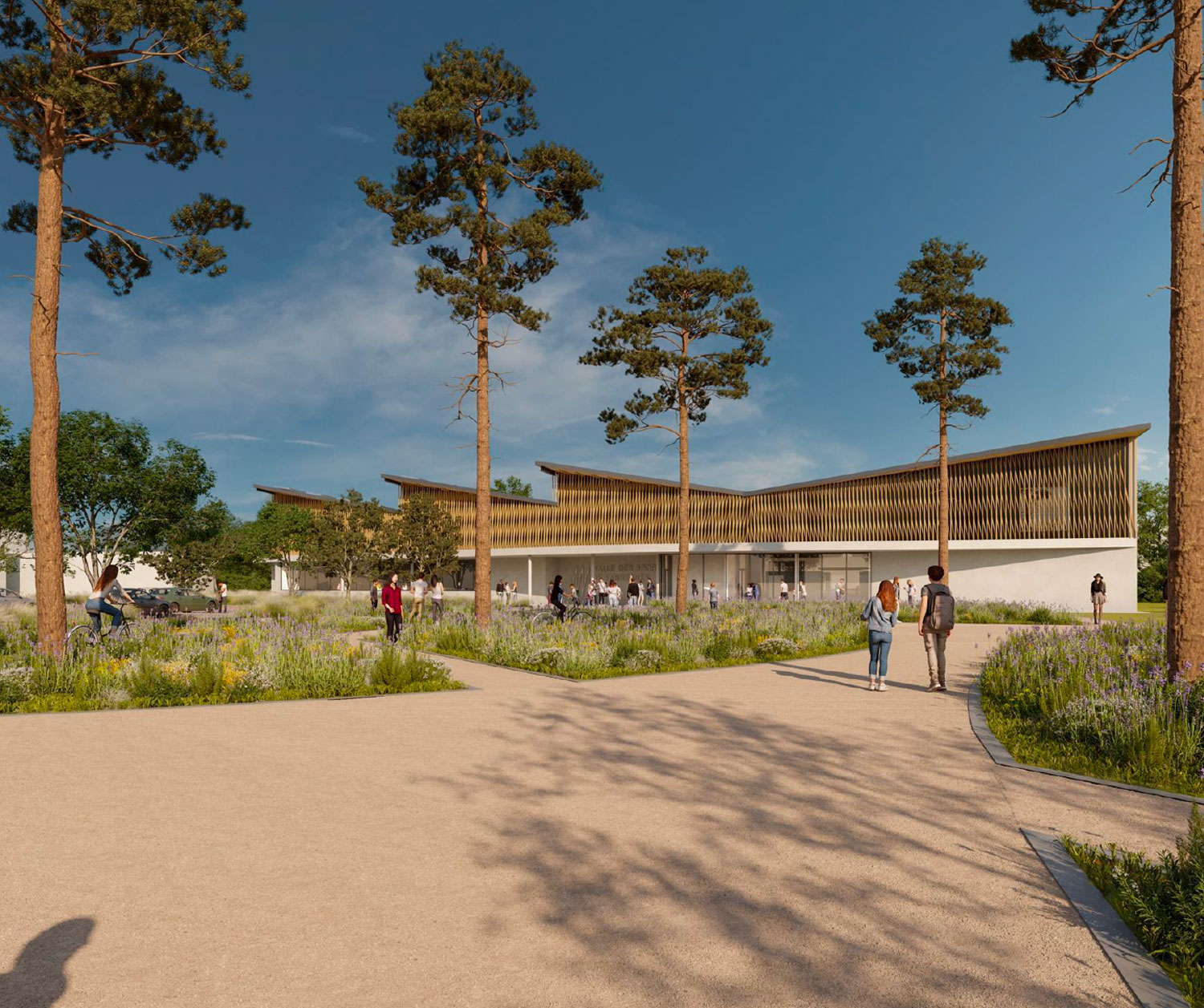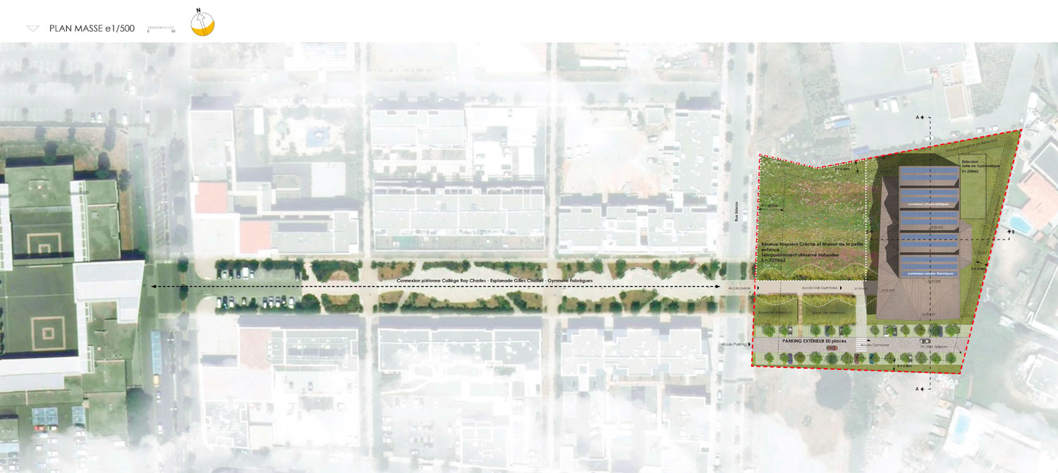 « Au travers d’une approche bioclimatique qui repose principalement sur l’orientation des locaux sportifs nord-sud pour en garantir le confort et la compacité volumétrique pour limiter les déperditions, nous proposons une architecture en bois avec les éléments les plus sollicités au droit du parvis en pierre massive. »