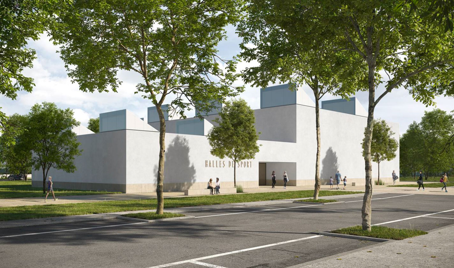 « La nouvelle halle de sports, implantée dans la perspective de l’esplanade, arbore une architecture composée de volumes parallélépipèdes disposés en strates horizontales. Les longues lignes horizontales du projet unissent l’ensemble des éléments du programme pour ne former qu’un élément unique et vivant. »