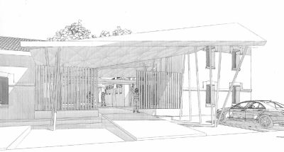 Ainsi, l’auvent d’entrée, voile en béton banché soutenu par des piliers en acier crée un signal fort depuis l’espace public et ouvre le site sur l’extérieur, actuellement plutôt fermé sur lui-même du fait de son activité initiale.