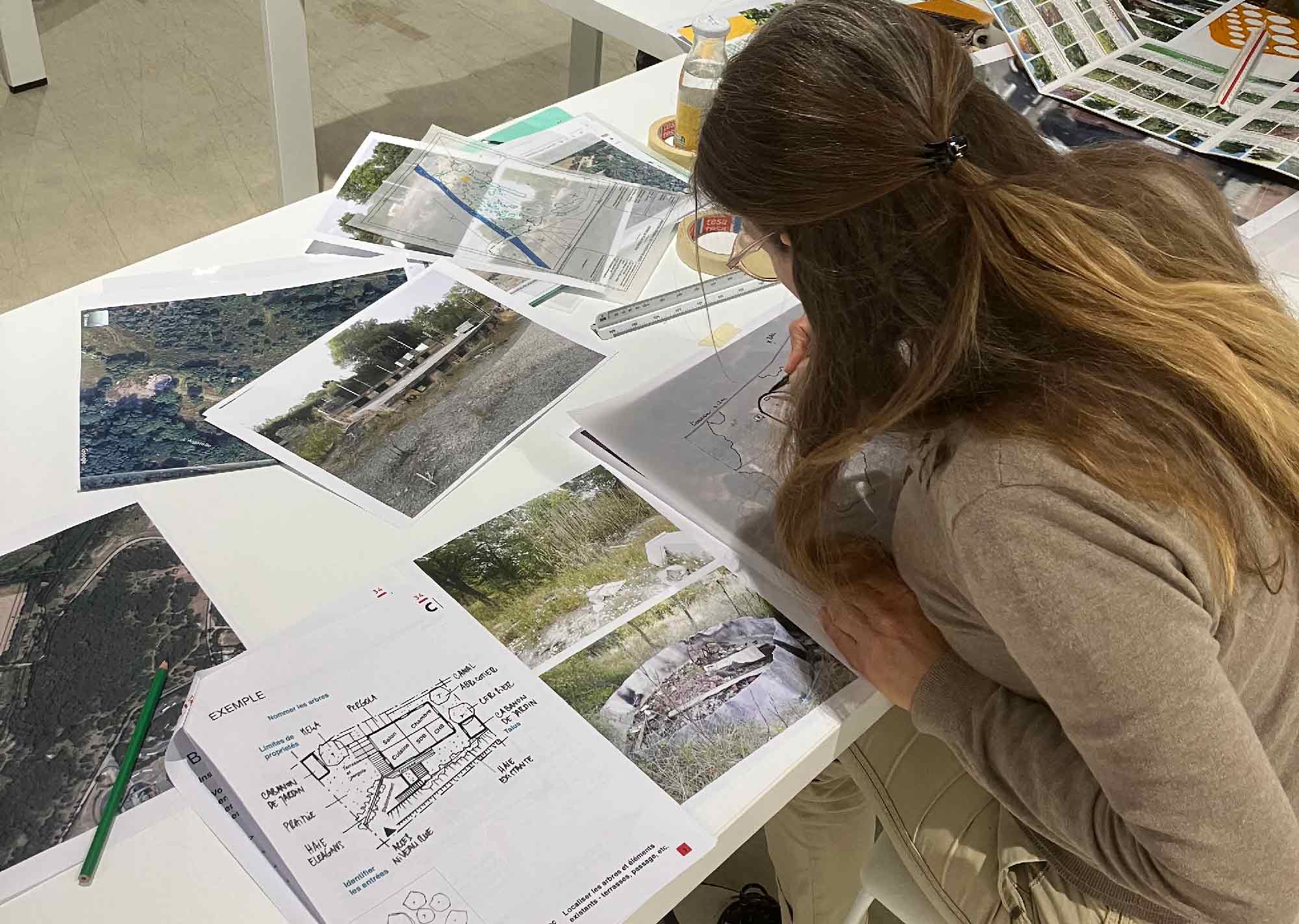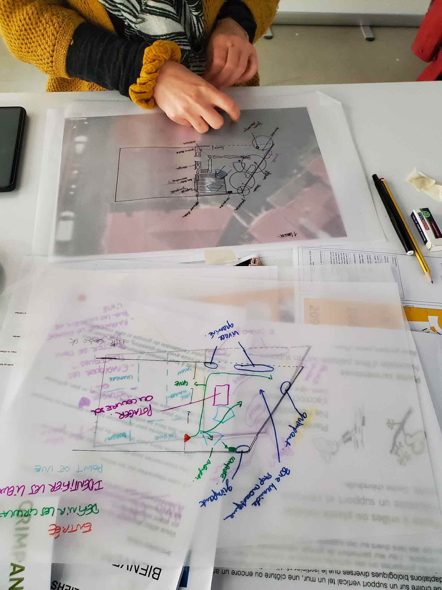 L’atelier a démarré avec une phase de diagnostic. Sur leur fond de plan orienté et à l’échelle, les participants ont dessiné les éléments existants : clôtures, bâti, végétaux, accès, terrasses… Quelques bases ont été posées : course du soleil, circulation des vents, identification des points de vue…permettant à chacun de commencer à regarder son jardin autrement.