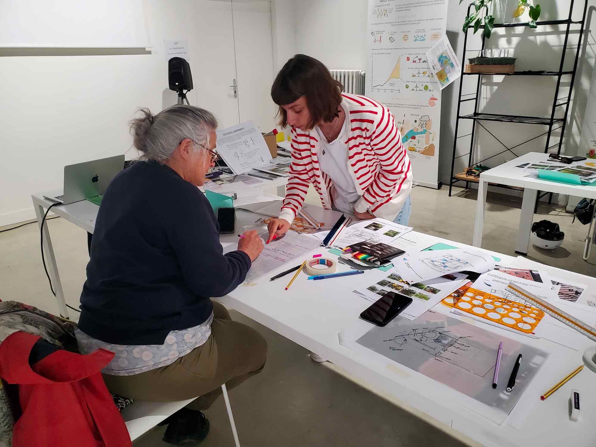 Place aux besoins et aux envies ! Coin potager, jeux d’enfants, zone de repos, abri vélo, mare, terrasse ombragée… Les participants identifient les usages en place à conserver, à déplacer, et les nouveaux à intégrer. Ils esquissent un programme en affectant un usage aux différents espaces du jardin et discutent avec leurs voisins d’atelier. Certains imaginent un coin calme pour lire à l’ombre, d’autres s’attellent à rendre leur jardin plus accueillant dès l’entrée. Les paysagistes accompagnent les participants dans leurs réflexions.
