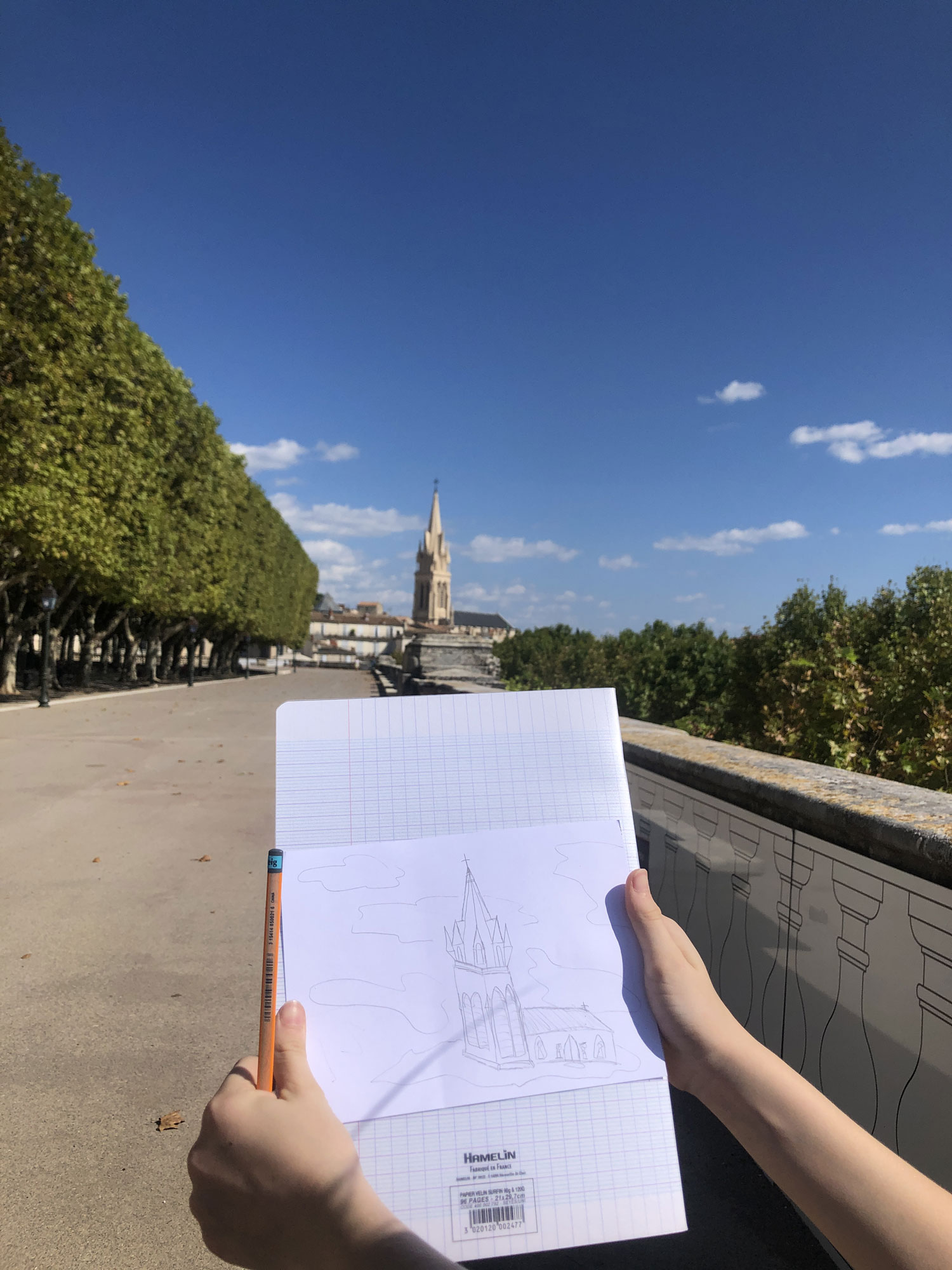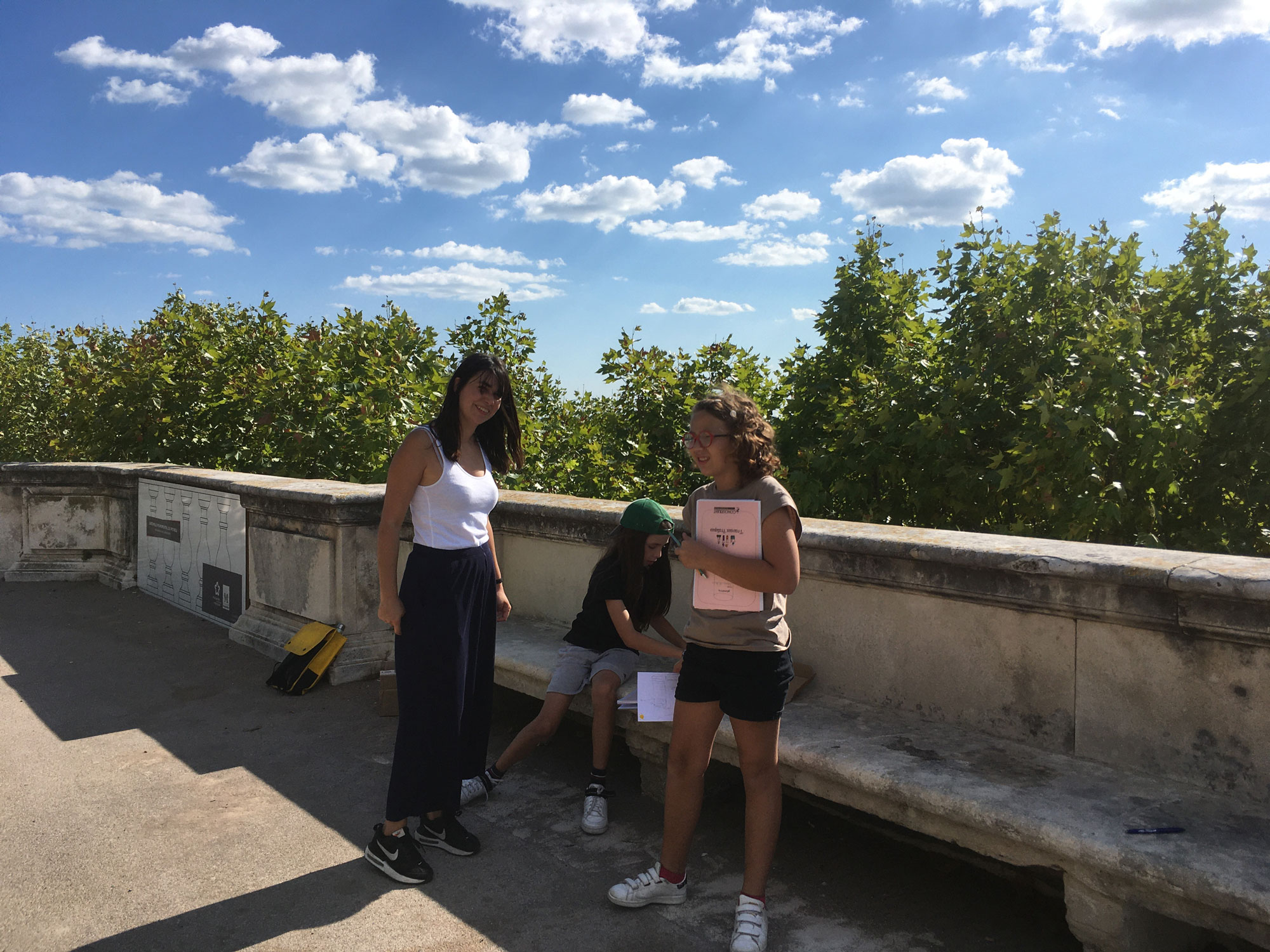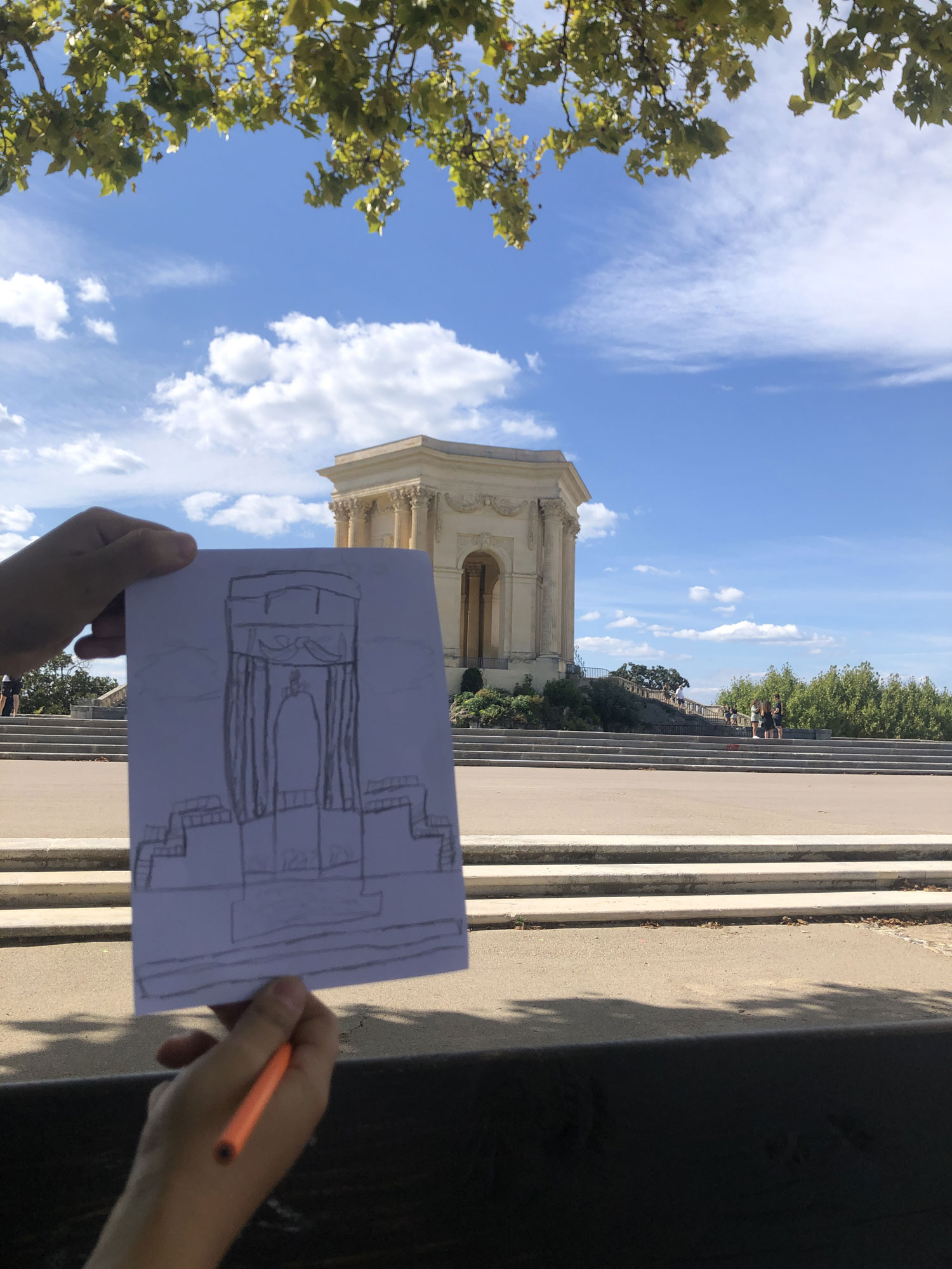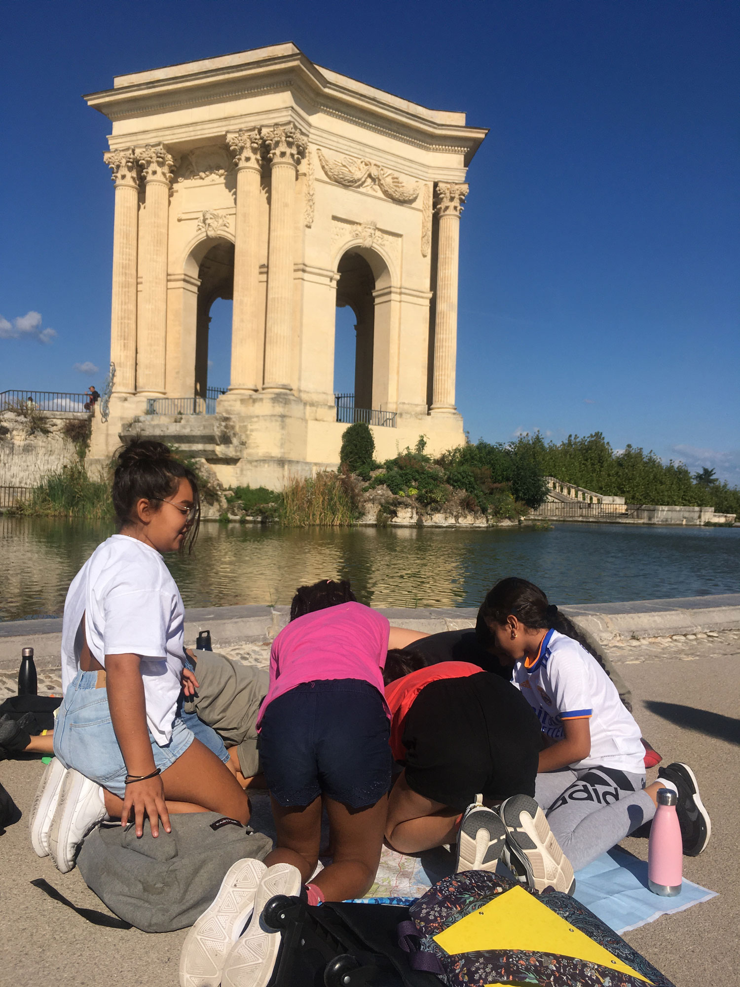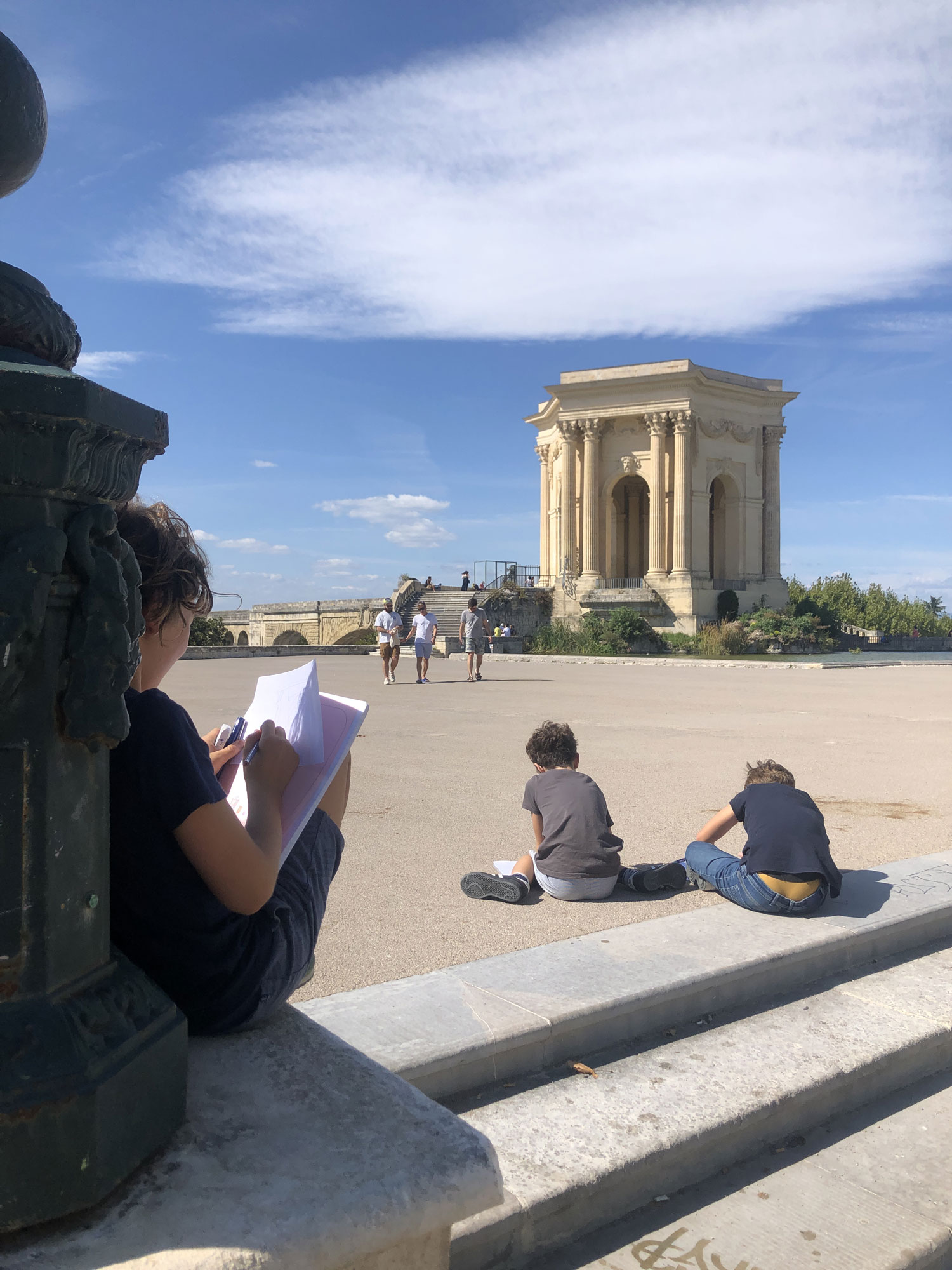 Sous la conduite de deux architectes, Lydie CHAMPONNOIS et Joséphine GUILLEMIN, les enfants ont pu découvrir, depuis le belvédère du Peyrou, les différentes composantes du paysage et ont participé à trois ateliers : repérage d’éléments du paysage sur une carte IGN, observation du décor du château d’eau, expression graphique des éléments observés.