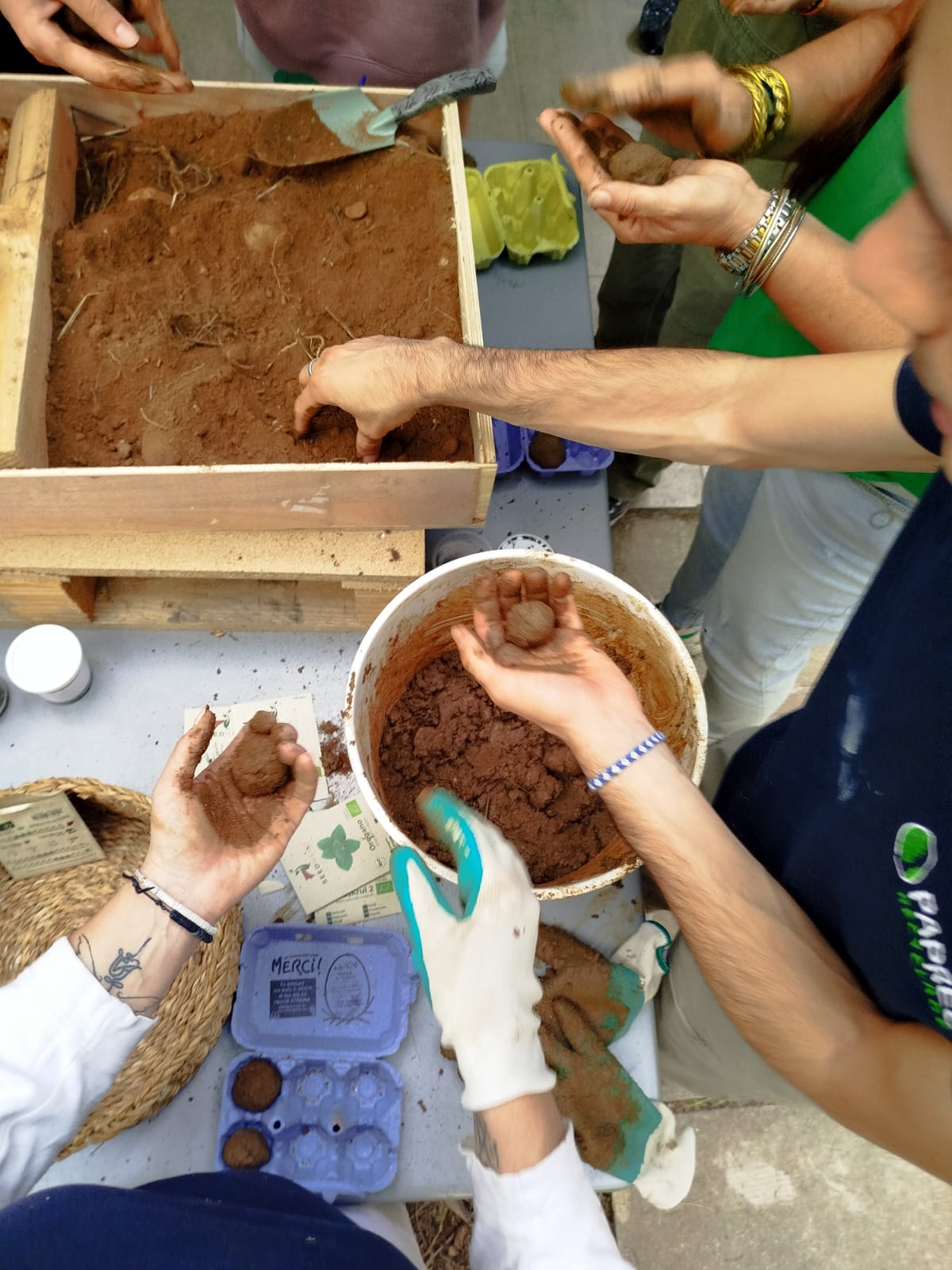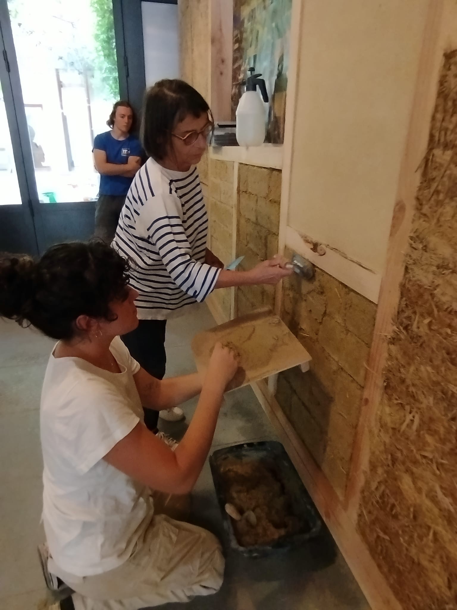 Les 14 participants ont pu notamment observer et manipuler le matériau terre, fabriquer des « bombes à graines » et s’initier à la réalisation d’enduits en terre.