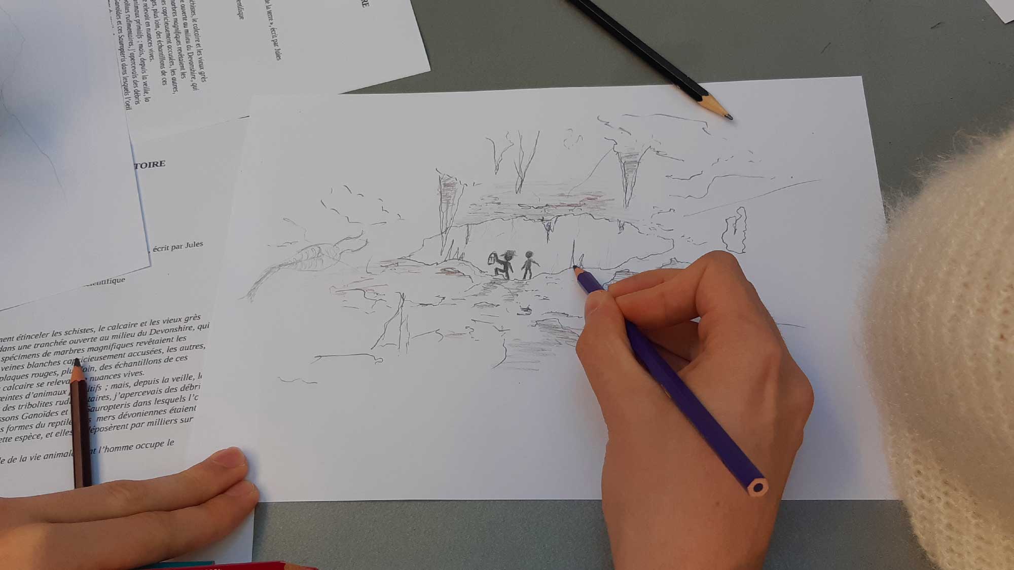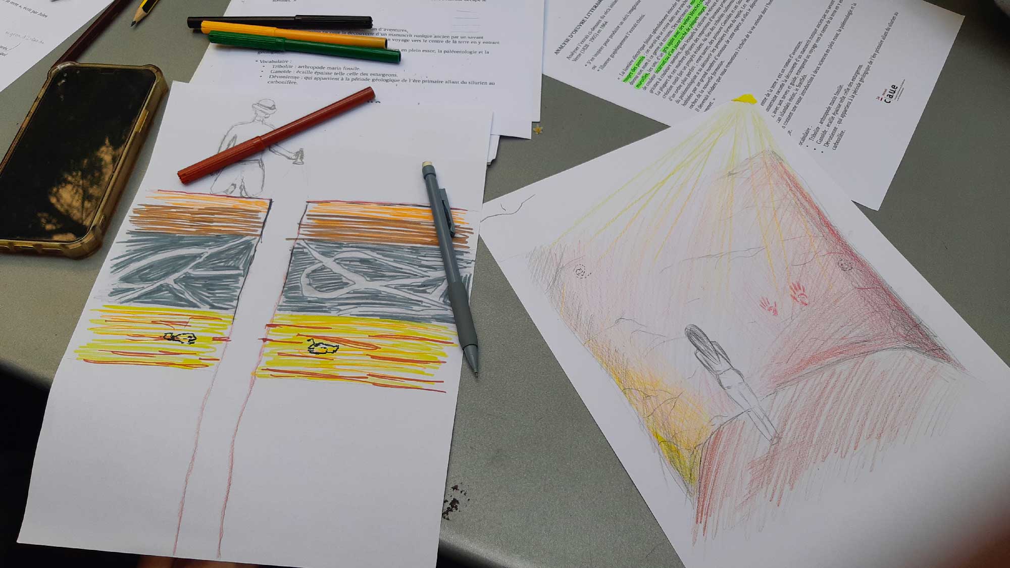 127 étudiants ont bénéficié de visites commentées de l’exposition par deux architectes de l’équipe. Ils ont pu tester leurs connaissances avec le carnet de jeux réalisé à leur intention. Les matériaux locaux (pierre et terre) présentés dans la cour du CAUE leur ont permis de se familiariser avec la richesse géologique des matériaux de construction, dans le département de l’Hérault. Les étudiants en design d’espace se sont prêtés, dans le prolongement de l’exposition, à un exercice graphique et/ou littéraire, en lien avec un extrait de “Voyage au centre de la terre”, de Jules Verne. D’autres étudiants ont complété la visite par une recherche au centre de documentation du CAUE 34, ce qui leur a permis de découvrir ce lieu riche en ressources, sous la conduite de Valérie Pérez, qui en a la responsabilité.