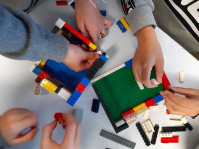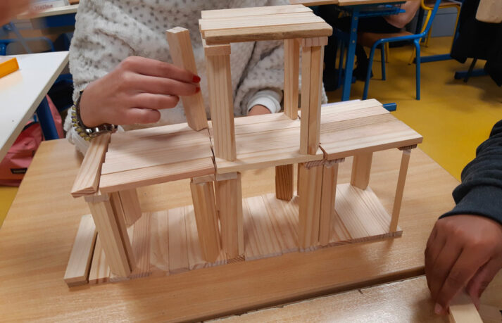 L’apport théorique, sous forme de présentation commentée d’un diaporama, a permis d’aborder la définition de l’architecture et ses cinq principaux éléments (fondations, structure, murs ou enveloppe, ouvertures, toit). Les écoliers ont pu expérimenter les deux principaux types de structures, par empilement de modules et à ossature, en utilisant des Lego et des Kapla.