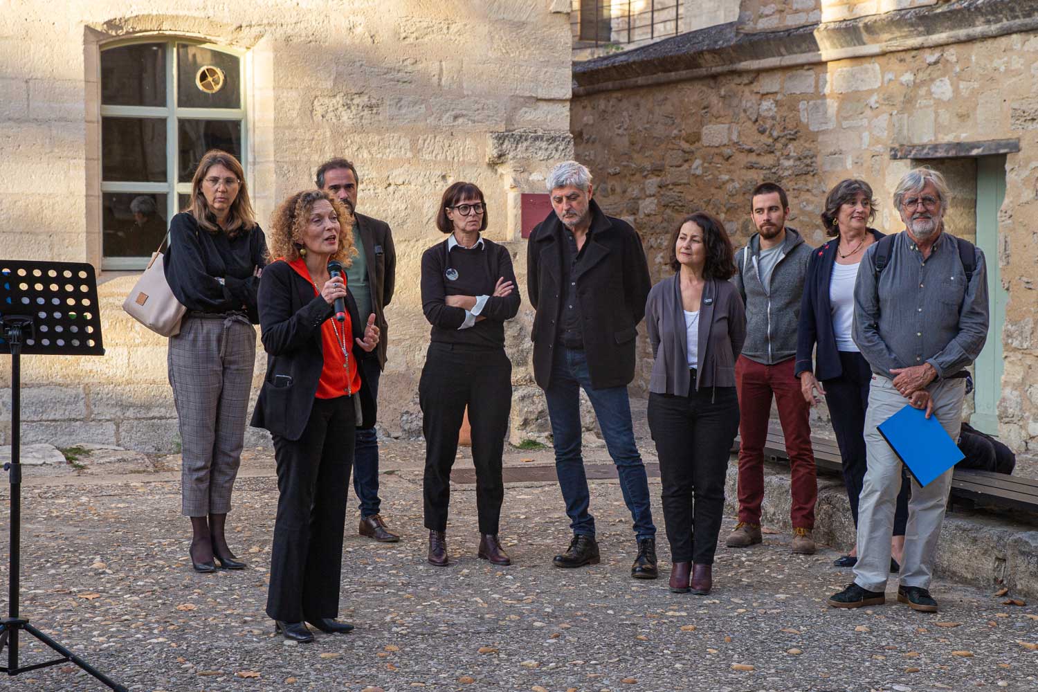 Inauguration des JNA, le 14 octobre à la Chartreuse. Au micro, Marianne Clévy, directrice de la Chartreuse. À sa droite, Pascale Bories, Maire de Villeneuve-lès-Avignon. Sur la photo, parmi les personnes présentes : Jamila Milki, conseillère pour l’architecture à la DRAC, Anne-Marie Llanta, architecte au CAUE 34 et Benjamin Revire, architecte.