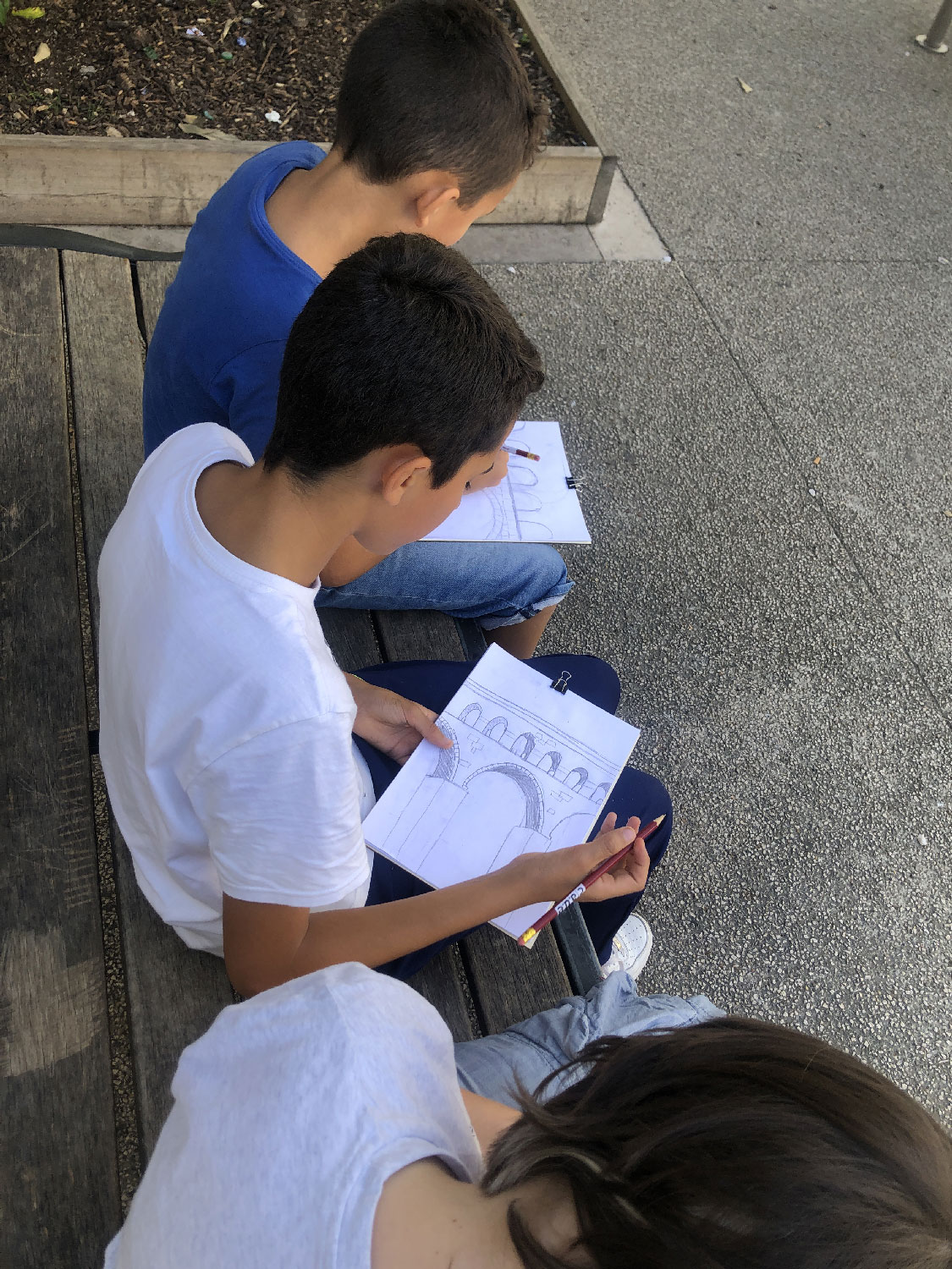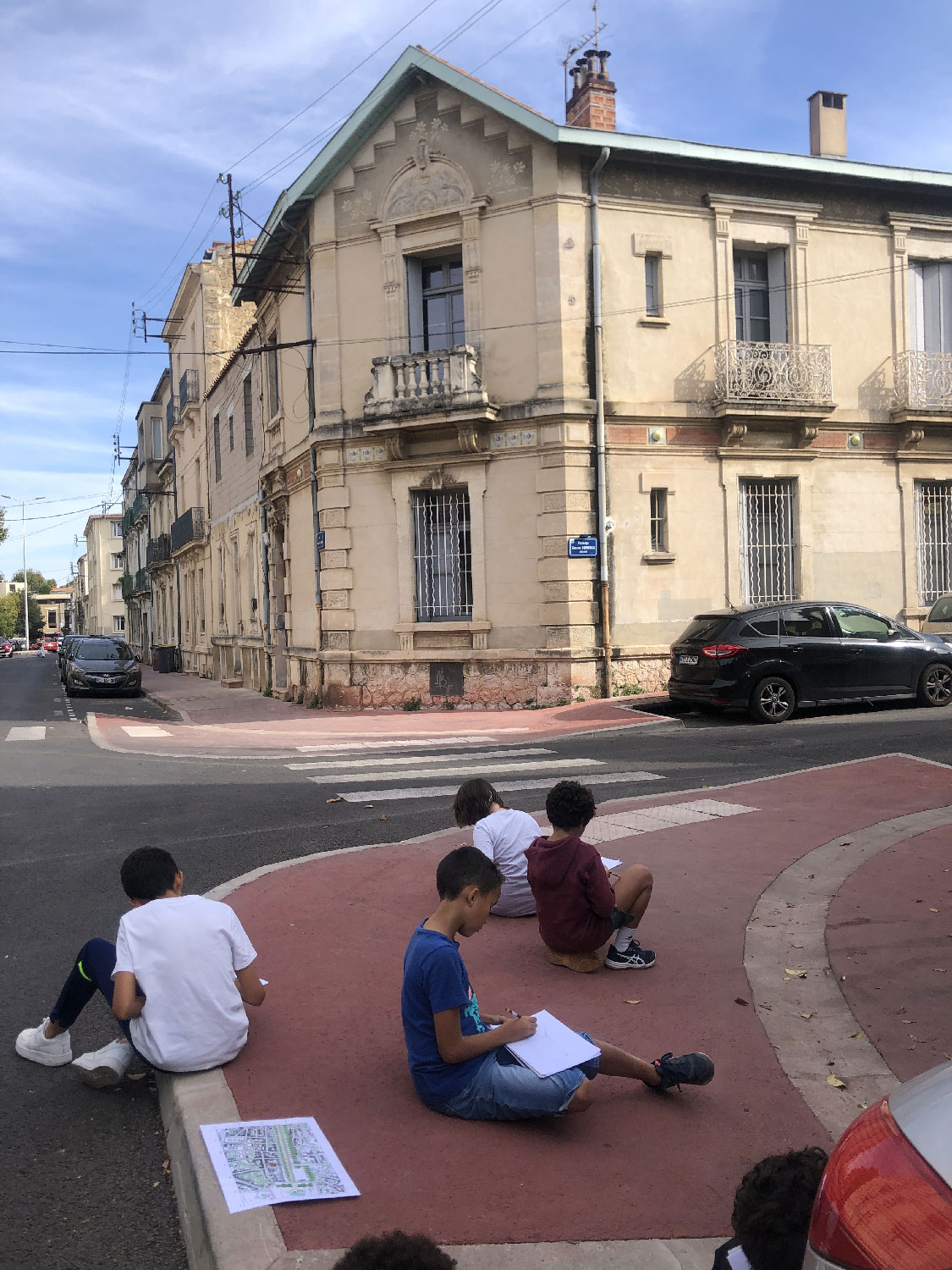 Le second atelier s’est déroulé le 4 octobre, sous forme d’un arpentage dans le quartier des Arceaux. Les jeunes ont pu observer les façades et comprendre différentes typologies architecturales, de la maison d’habitation individuelle à l’hôtel particulier, en passant par les immeubles d’habitation. Ils ont réalisé plusieurs croquis de façades, en prenant soin de respecter les proportions de chaque édifice.