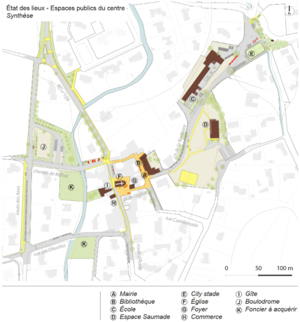 Sur la base d’un état des lieux sommaire, le CAUE constate une déconnexion des sites entre eux. Les équipements communaux, le centre ancien, les extensions urbaines mériteraient d’être mis en relation par un espace public de qualité, en accord avec le paysage dans lequel ils s’inscrivent.
