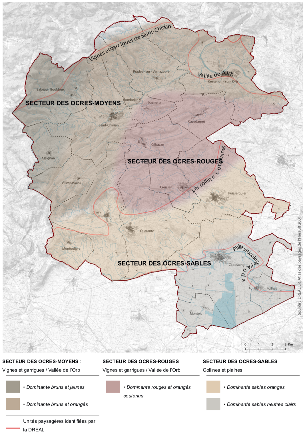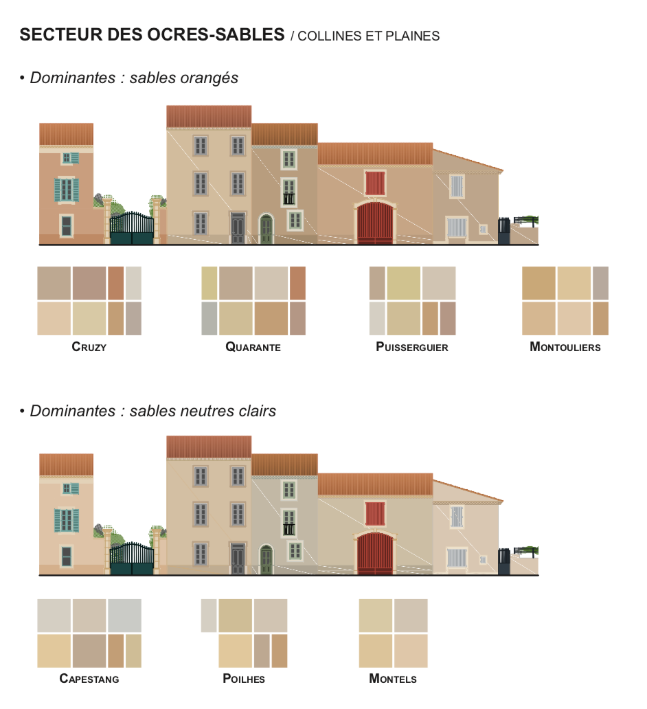 - Les tendances chromatiques en relation au territoire Sud-Hérault permettent de distinguer trois secteurs : celui des ocres moyens, celui des ocres rouges et celui des ocres sables.