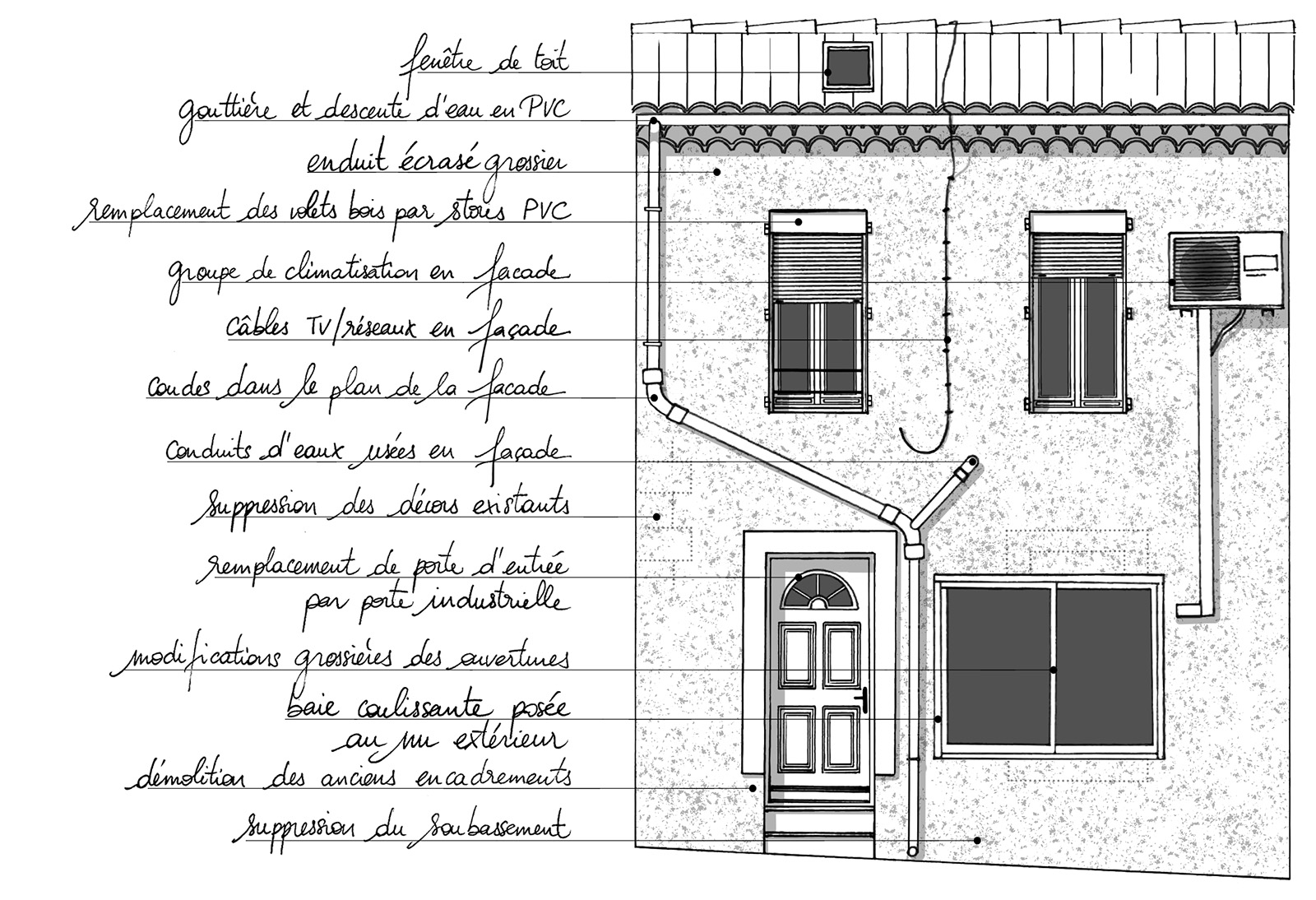 - Les dénaturations architecturales récurrentes rencontrées sur une façade courante. Documents CAUE34.