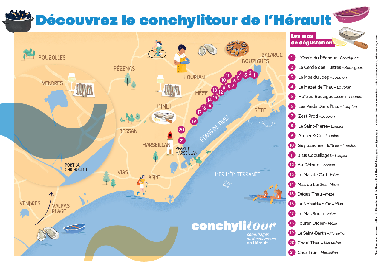 Dans le cadre de la convention d’objectifs avec le Département de l’Hérault, le CAUE de l’Hérault accompagne le Conchylitour, en portant un regard global sur 39 mas conchylicoles, situés de Marseillan à Bouzigues, parmi lesquels 21 mas de dégustation ayant candidaté pour le label “Mas partenaire” proposé par le CD 34. Ce partenariat fait tout naturellement suite à celui entrepris dans le cadre du conseil aux caveaux œnotouristiques, autre filière soutenue depuis longtemps par le Département, avec la création de l’Œnotour.