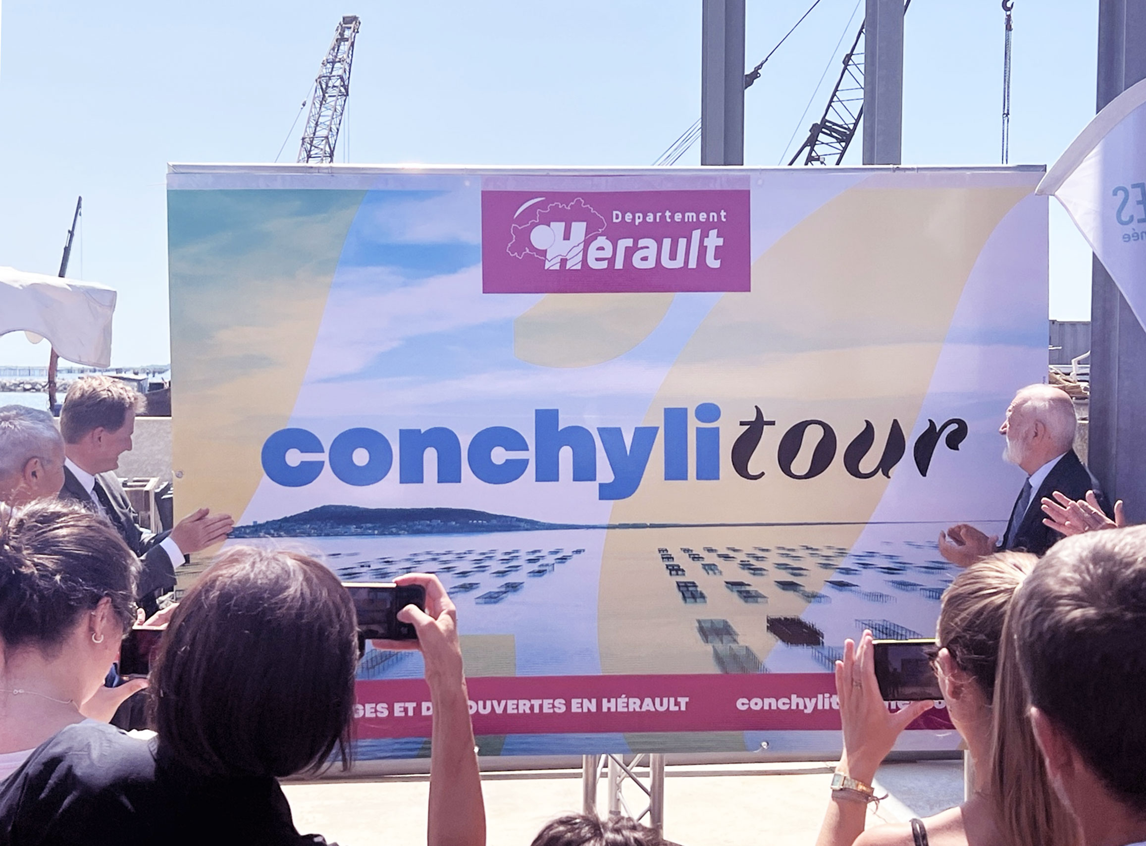 Le 18 juillet 2024, le Département de l’Hérault a inauguré le Conchylitour au mas expérimental du Comité régional conchylicole de Méditerranée (CRCM), situé dans le Port départemental du Mourre blanc à Mèze. Ce nouveau concept valorise le patrimoine conchylicole de l’Hérault autour du Bassin de Thau et du Port de Vendres. En tribune, Kléber MESQUIDA, président du Département 34, François-Xavier LAUCH, préfet de l’Hérault, les élus locaux, ainsi que des professionnels de la conchyliculture.