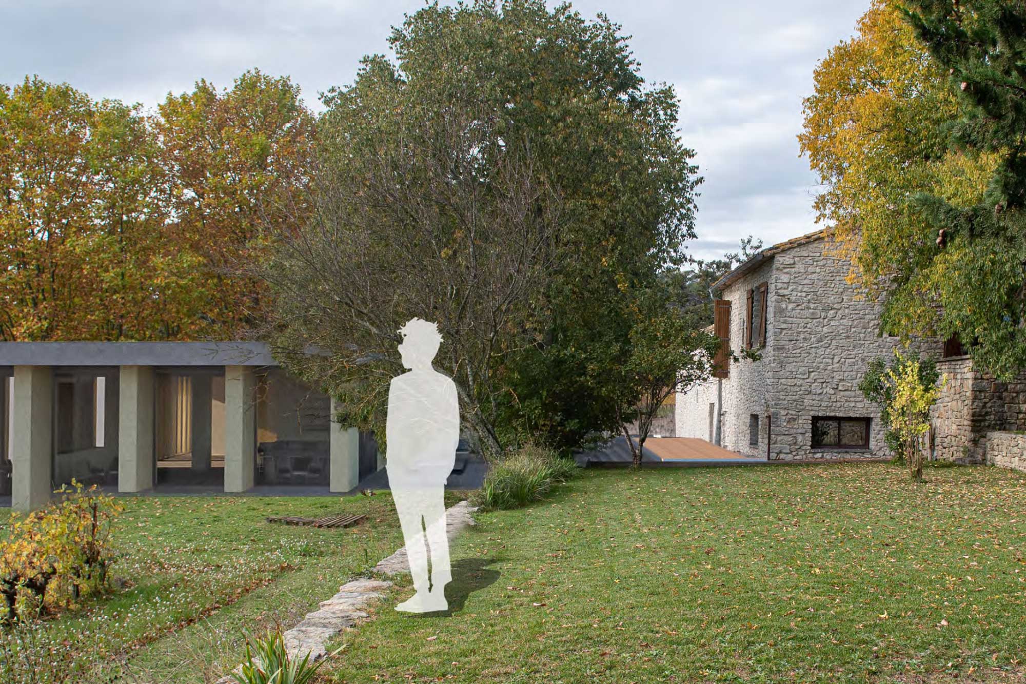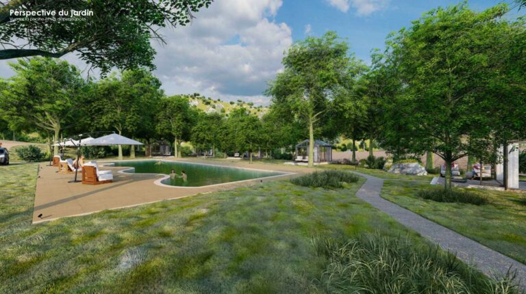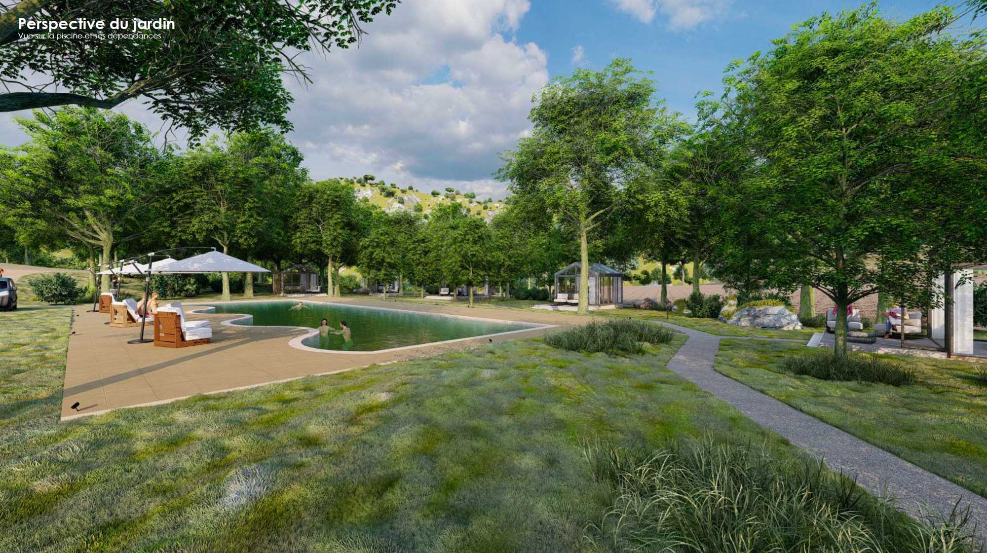 - Perspective du jardin – Vue sur la piscine et ses dépendances