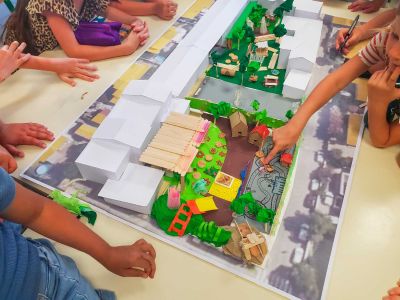 Répartis en deux groupes, les écoliers ont travaillé à partir d’une “feuille de route” qui résumait les deux scénarios issus des étapes précédentes de concertation. Leur mission : donner vie à ces scénarios d’aménagement en représentant les différentes zones d’usage, la végétation, les sols ou encore le mobilier.