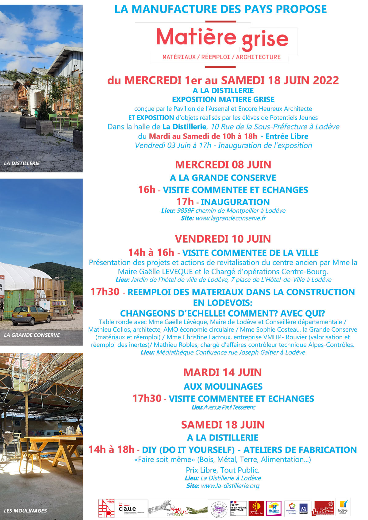 Réalisée par le Pavillon de l’Arsenal, l’exposition « Matière grise – Matériaux / Réemploi / Architecture » – d’abord exposée à Montpellier du 6 avril au 28 mai au Centre d’art La Fenêtre et au CAUE de l’Hérault – est à découvrir à Lodève jusqu’au 18 juin 2022. Elle est présentée à La Manufacture des Pays, au sein du Tiers-Lieu de La Distillerie. Plusieurs événements l’accompagnent : conférences, visites, ateliers…