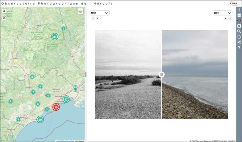 Depuis 1992, le CAUE de l’Hérault a initié un Observatoire photographique du paysage, outil de veille qui permet d’observer d’année en année l’évolution de notre territoire. Le premier itinéraire de 53 points fut dessiné et photographié par Raymond DEPARDON, photographe et réalisateur. Ensuite, c’est Frédéric HÉBRAUD, photographe et graphiste pour le CAUE 34 (et aussi… artiste peintre) qui de 1993 à 2020 a sillonné l’Hérault pour perpétuer les séries de l’OPP 34. Au gré des modifications de paysages, certains points – aux coordonnées GPS précises – n’ont pu être reconduits. Frédéric a donc dû abandonner quelques séries et il a fait le choix d’en ajouter d’autres. L’OPP 34 compte désormais 67 points.