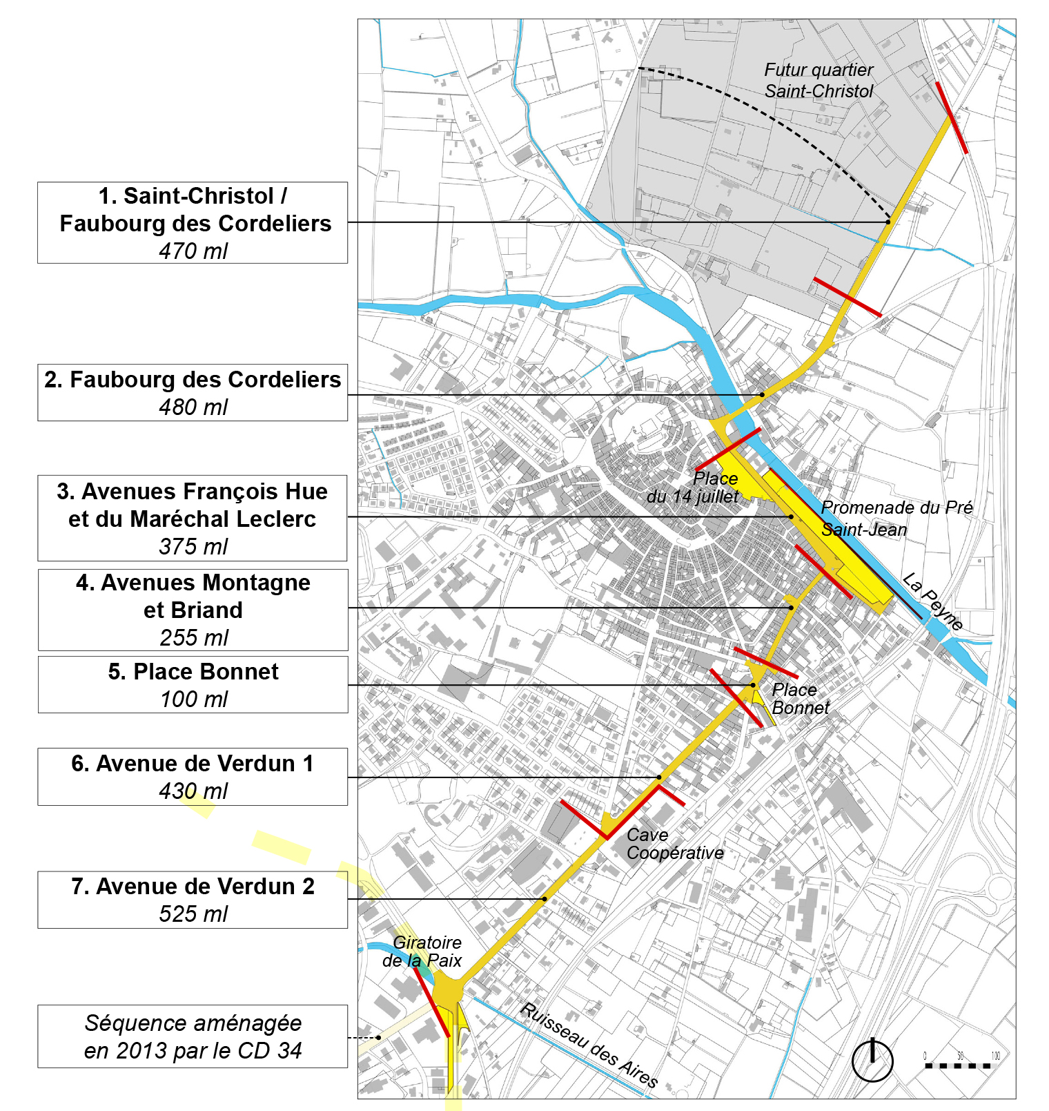 Sur la base d’un cahier des charges élaboré par le CAUE 34, une consultation de professionnels a été lancée par la ville. La commission, constituée de l’ensemble des partenaires cités ci-dessus, a proposé de retenir l’équipe : Atelier SITES (paysagistes) mandataire avec INDDIGO (déplacements urbains), Maurice FOUILHE (concepteur lumière) et BET MERLIN (VRD). Cette proposition a été validée par la municipalité.