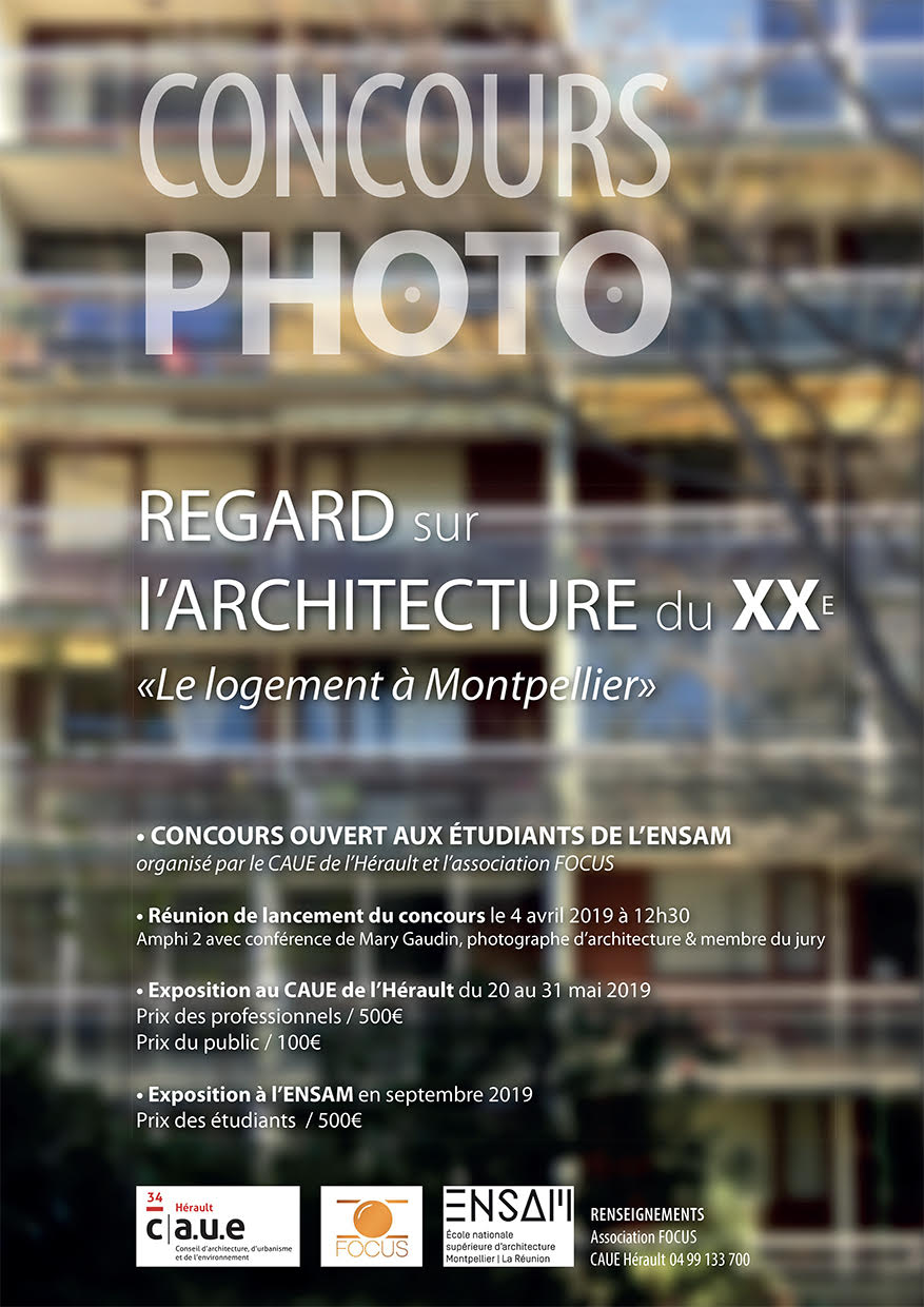 Concours photographique, organisé par le CAUE de l’Hérault, du 4 avril au 7 mai 2019, à destination des étudiants de l’Ensam, en partenariat avec l’Ensam et l’association photographique Focus. Les lauréats verront leurs photos exposées à La Salle du CAUE 34, du 20 au 31 mai, puis à l’école d’architecture en septembre.