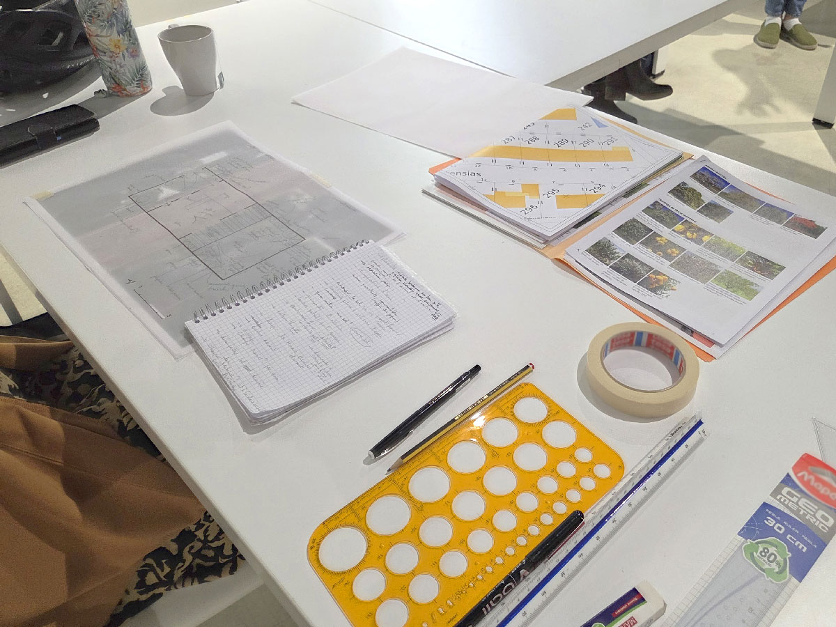 Après une introduction aux principes de conception d’un jardin, les participants ont trouvé sur leur table tout le nécessaire pour élaborer eux-même leur projet de jardin: extraits de plans, photographies, matériel de dessin. En effet, en dessinant «à l’échelle» on peut représenter en miniature son chez-soi pour mieux le manipuler et le transformer. Pour chaque terrain, un mini-diagnostic est ainsi posé. Il permet de représenter les accès du jardin, ses limites, de comprendre son exposition au soleil, aux vents, de prêter attention à sa pente, etc. Ce faisant, les particuliers apprennent à regarder autrement leur jardin et à envisager leur potentiel.