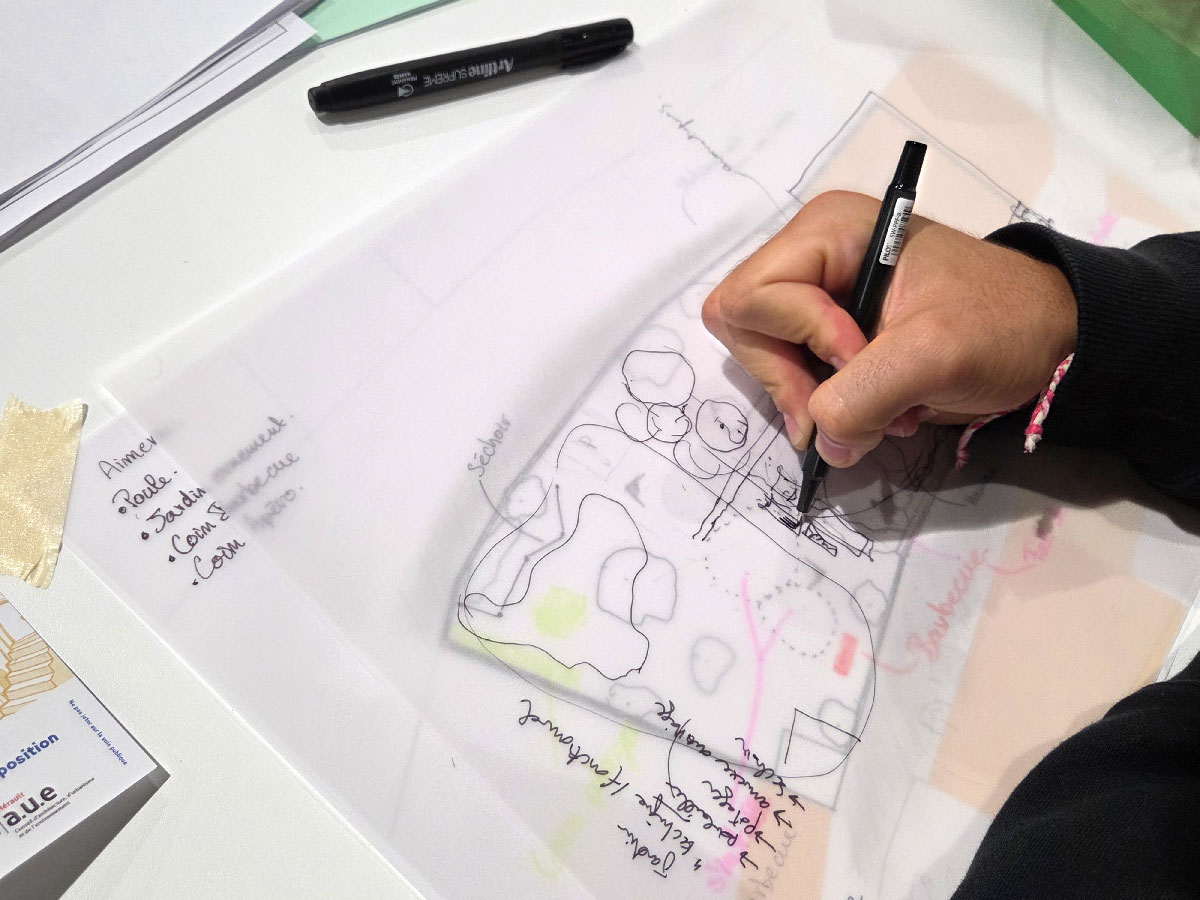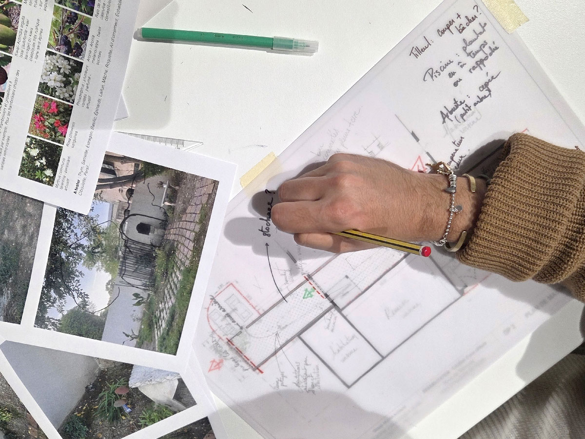 Bien connaître son terrain, c’est une chose, mais quels sont les besoins, les envies? potager, table pour les repas en famille, lieu de rafraîchissements, jeux et sports, abri vélo, accueil de la faune… Comment traduire cela en projet dans l’espace? Le jardin a-t-il les capacités pour les accueillir? À l’aide de feuilles de papier calque, les participants schématisent leurs idées sur le plan du jardin avec des flèches, cercles, ellipses et diverses annotations… C’est un peu le brouillon du jardin en devenir qui commence à apparaître.