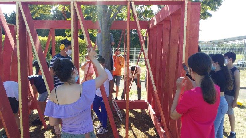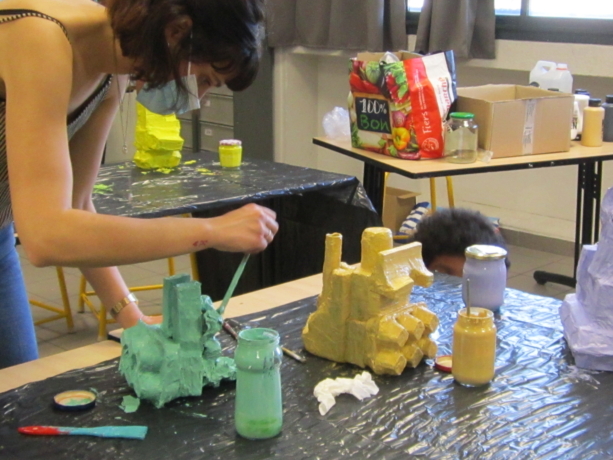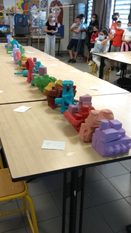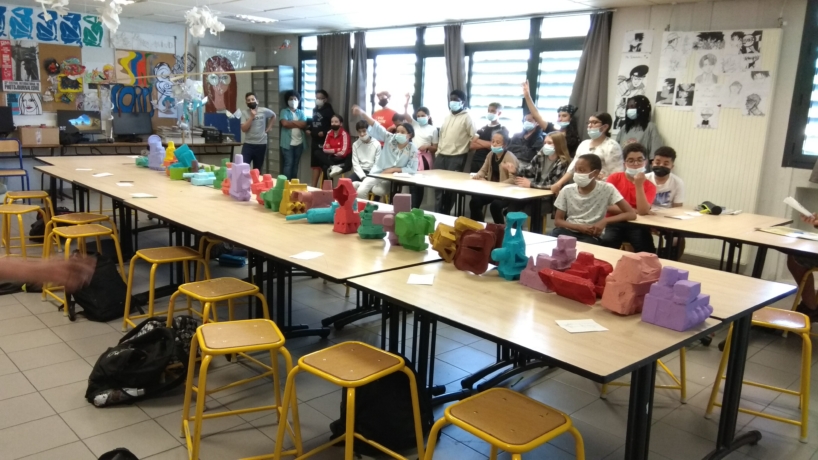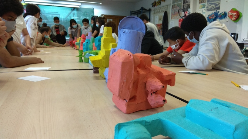 Grâce à un accompagnement conjoint avec leurs professeurs et les artistes, une soixantaine d’élèves de 5ème ont pu co-construire des installations à la vue de l’ensemble des collégiens.