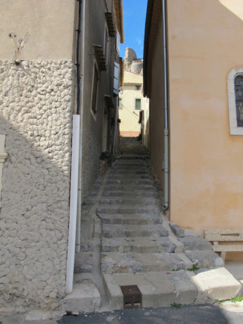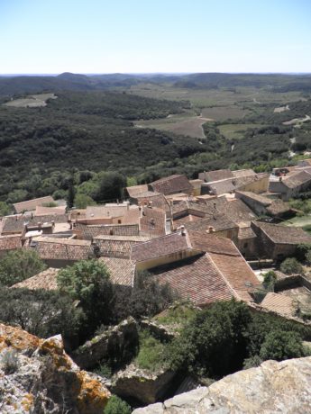 Depuis cette ruelle du village, les vestiges du château émergent en arrière plan. Crédit photo : Sylvaine Glaizol / CAUE 34