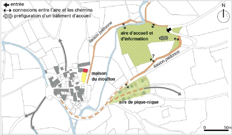 Fonctionnement de principe : L’accès voiture se fait au niveau du premier virage avant le hameau. Les anciens chemins permettent de relier l’aire d’accueil au hameau et à l’aire de pique-nique, ancien parking requalifié et végétalisé. Le bâtiment d’accueil, qui fonctionne en complémentarité avec la maison du mouflon, est implanté à proximité de l’entrée. Crédit : CAUE 34