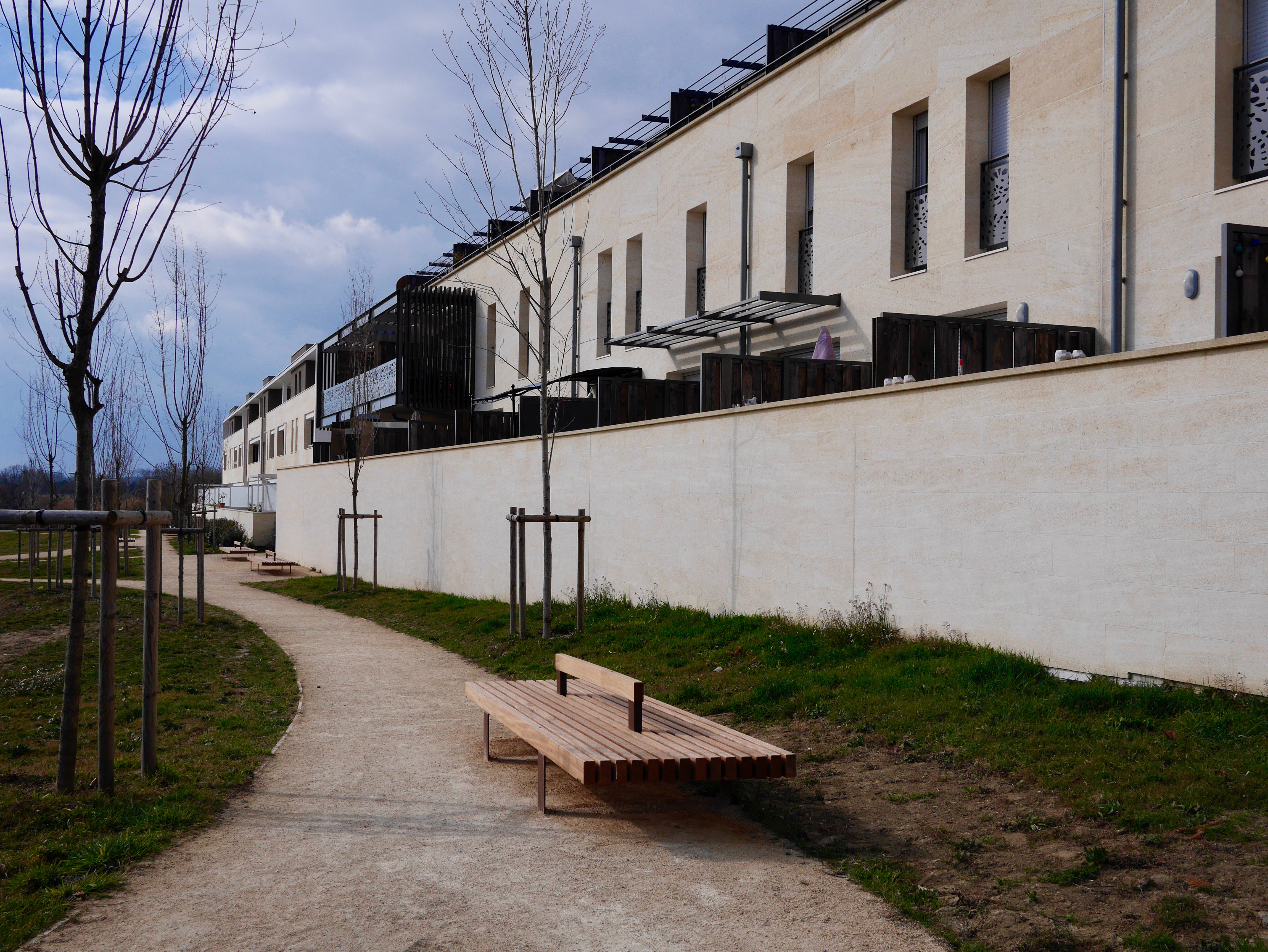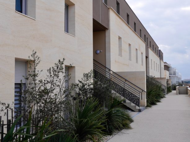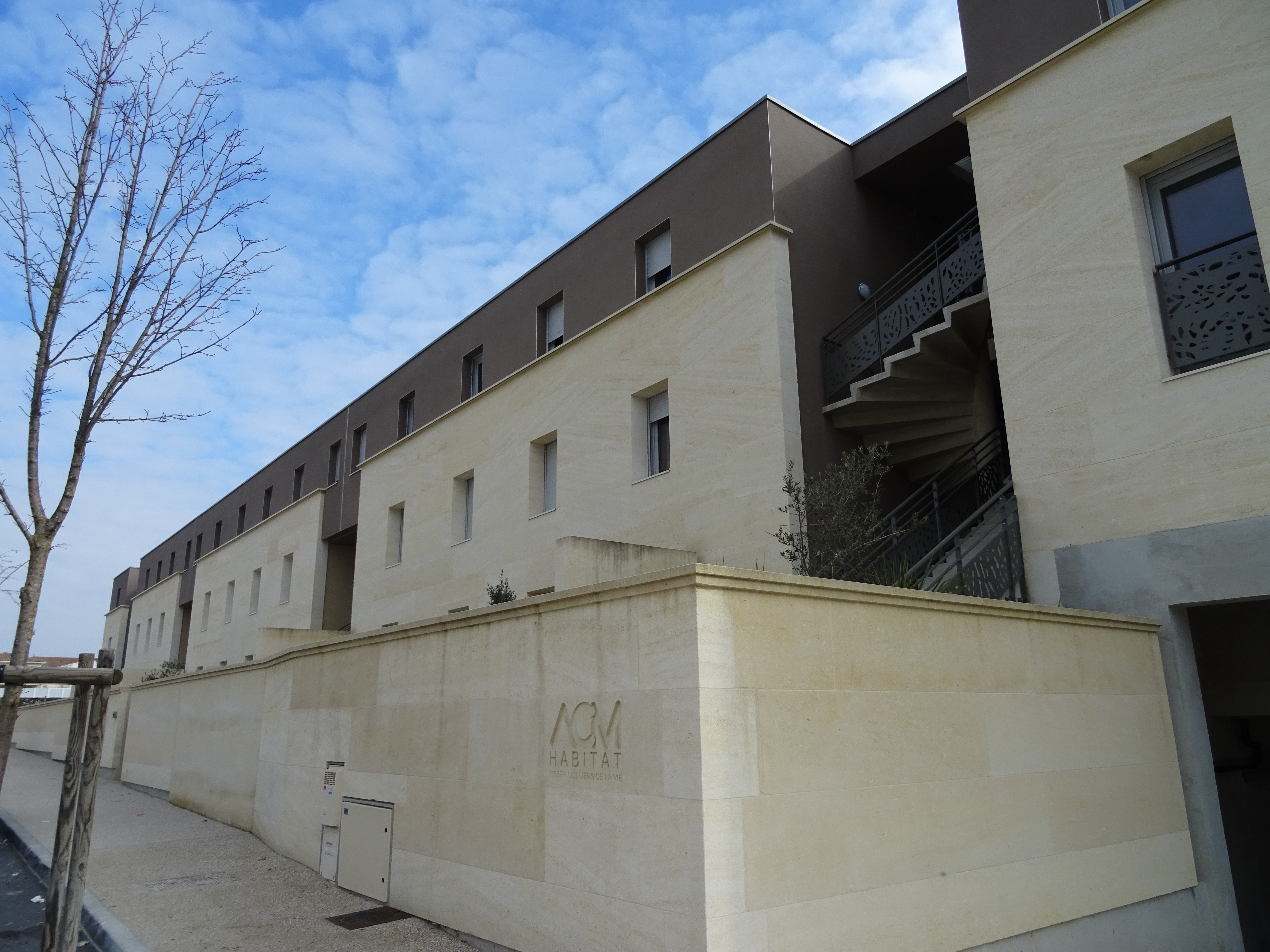 180 logements, dont un tiers de logements sociaux, répartis en plusieurs résidences indépendantes, seront réalisés par différents maîtres d’ouvrage et architectes sur la base d’un plan d’ensemble. Sollicitées par ACM Habitat pour la conception de l’un de ces “lots”, Christel et Béatrice ont conçu leur projet en pierre de Castries, matériau prescrit dans les orientations de la ZAC. Composée de 30 logements (appartements de plain-pied, duplex, maisons), la résidence s’ouvre au sud sur un vaste parc qui assure la rétention des eaux pluviales.