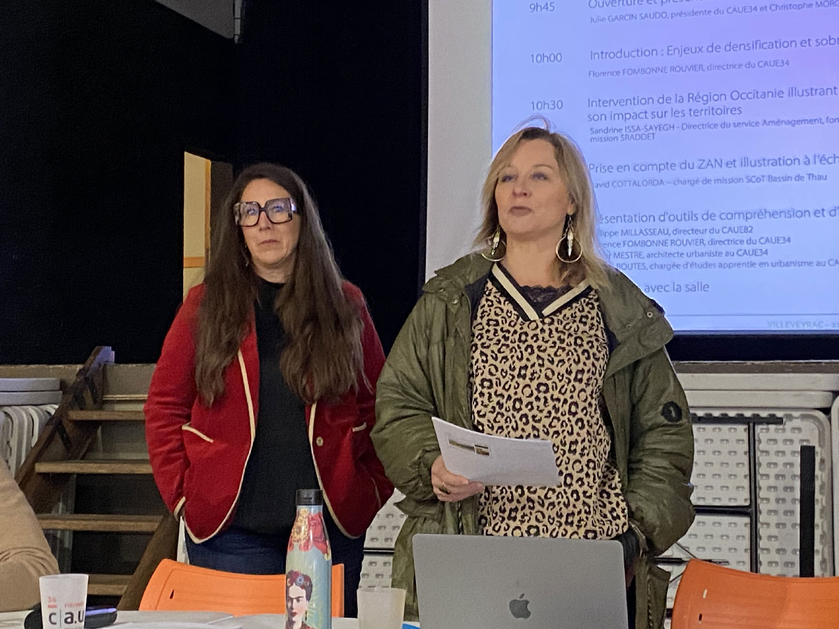 Après l’ouverture et présentation de l’Atelier par Julie GARCIN SAUDO, présidente du CAUE 34, la matinée a débuté par une analyse des cadres législatifs nationaux, avec la loi Climat et résilience par Florence FOMBONNE ROUVIER, directrice du CAUE34, suivie de son interprétation régionale par Sandrine ISSA-SAYEGH, directrice Aménagement, foncier et urbanisme de la Région Occitanie & Florian FONTANAUD, chargé de mission SRADDET Occitanie : quelle prise en compte du ZAN à l’échelle du SRADDET et quel est son impact sur les territoires ? Puis, David COTTALORDA, chargé de mission SCOT du Bassin de Thau, SMBT, a évoqué le ZAN à l’échelle des SCoT dans l’Hérault.