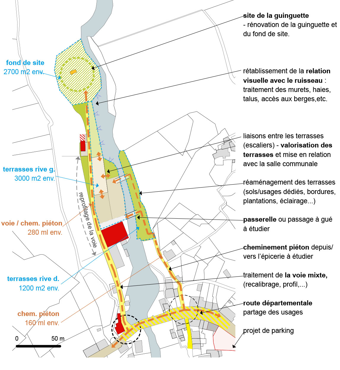 Après repérages et échanges avec les élus, le secteur du village le plus propice à cette création est potentiellement celui de “l’entrée des Gorges”, l’une des entrées du massif où se trouvent notamment la mairie, l’école, la bibliothèque, deux salles communales, une buvette, une épicerie…