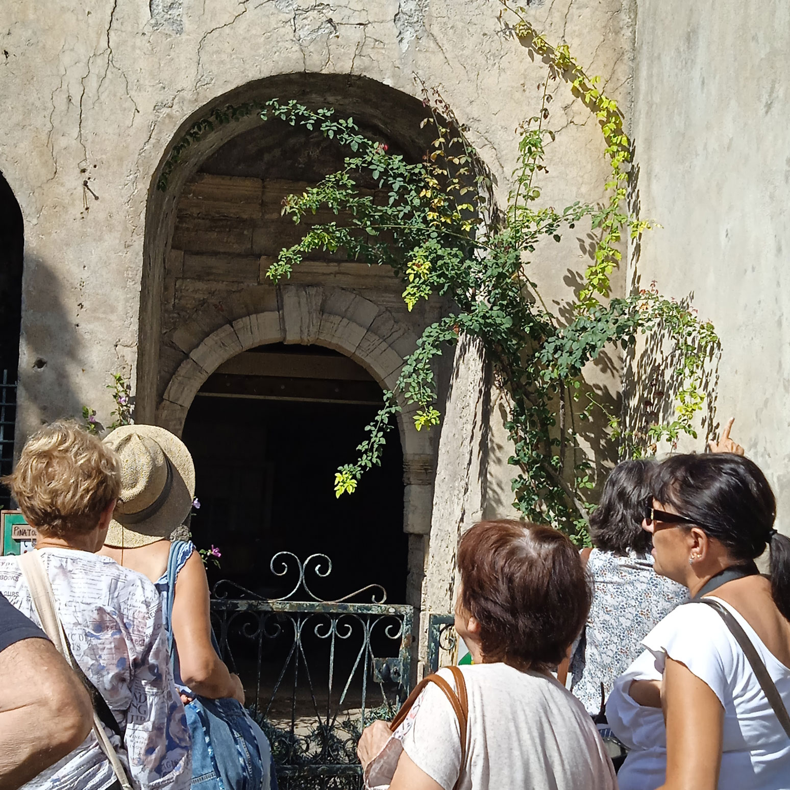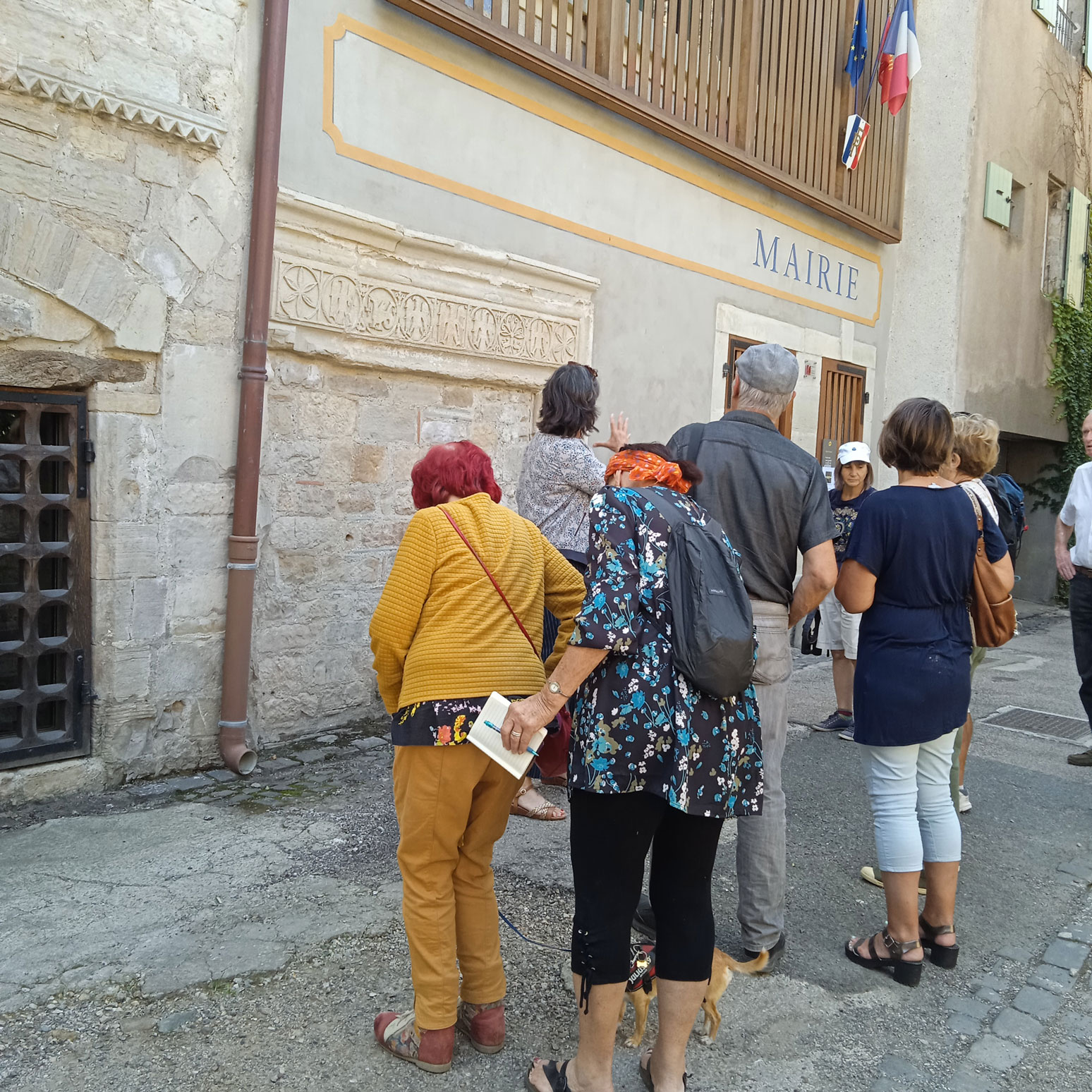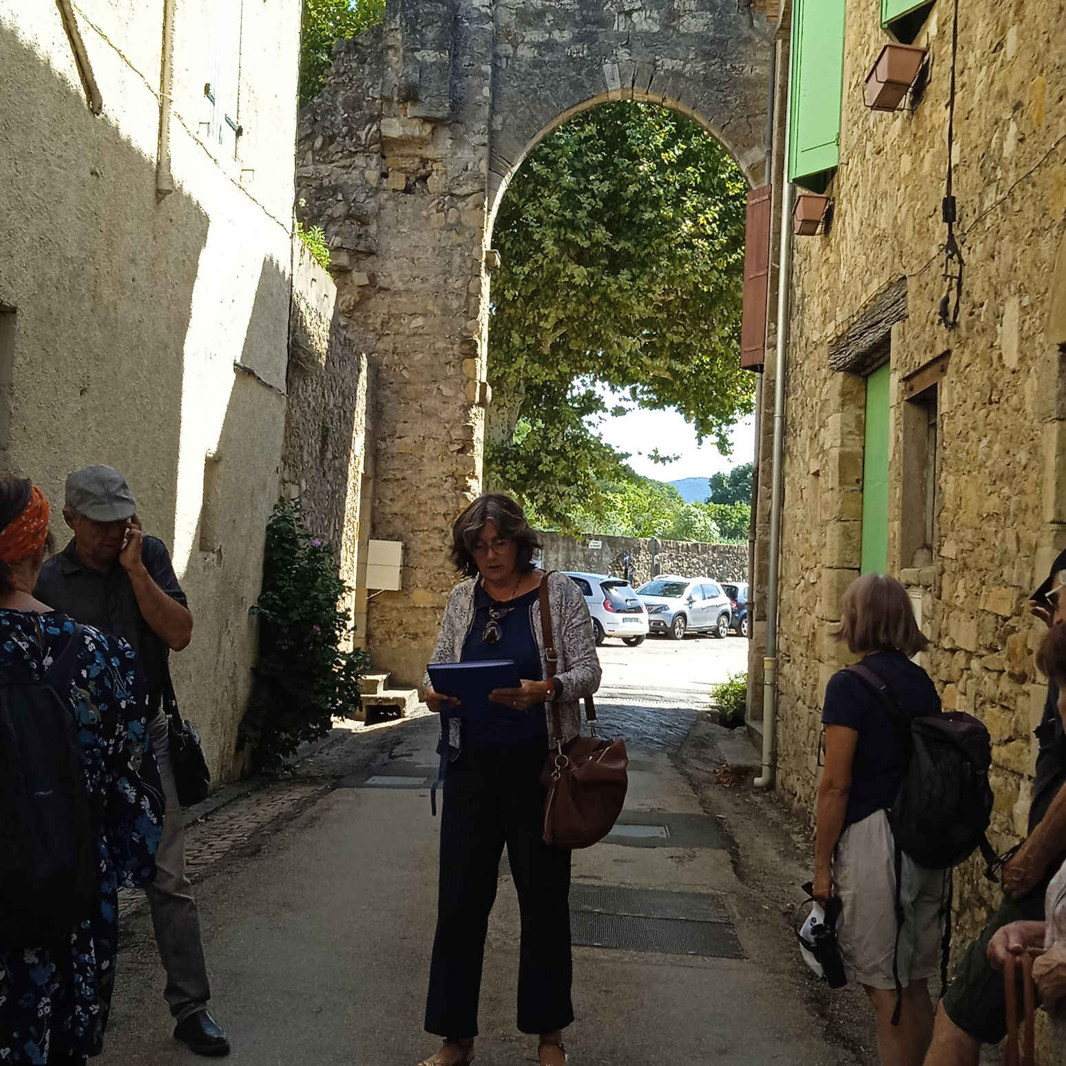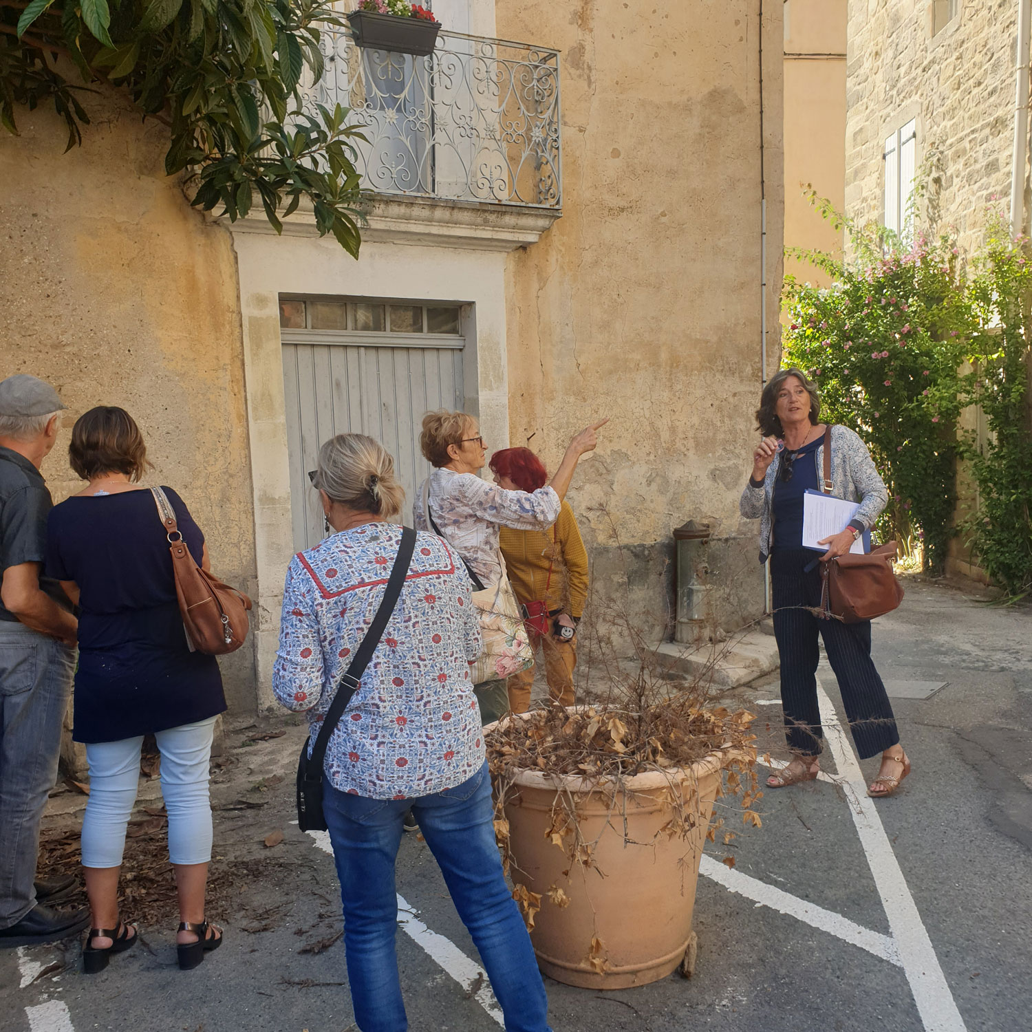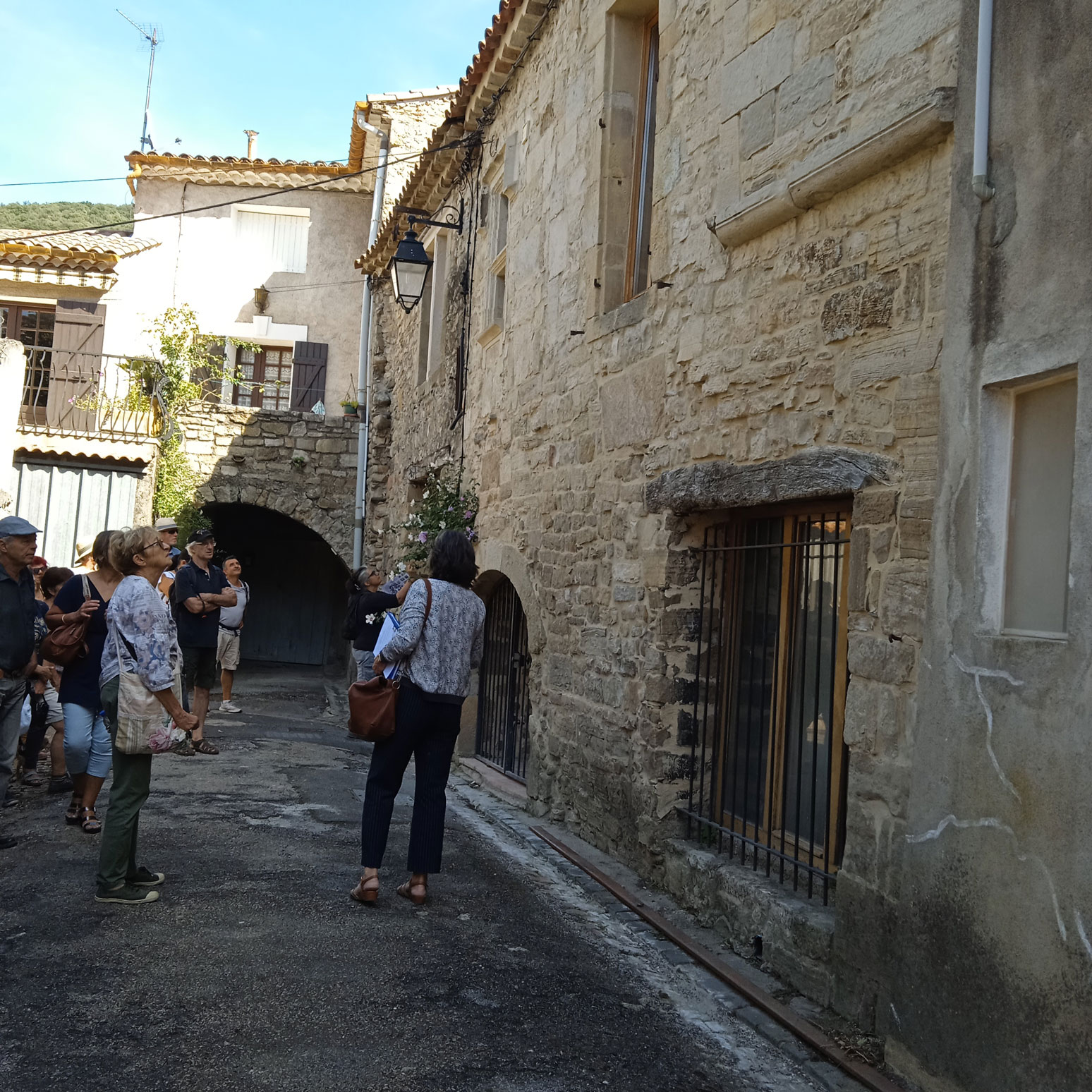 À l’extrémité de la Grand-Rue, la Porte de la Barbacane a permis d’évoquer le système défensif du village. Dans la rue de l’Hôpital, de très belles fenêtres Renaissance ont été repérées par les participants, qui ont découvert ensuite, rue du Couvent, quelques maisons viticoles caractéristiques, qui regroupent sous un même toit habitation, cave et pailler.