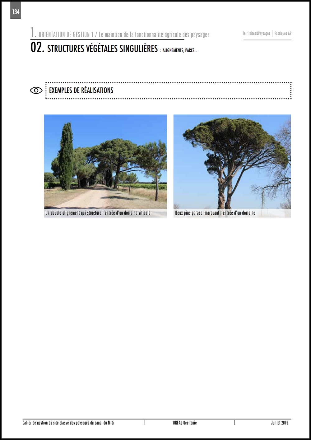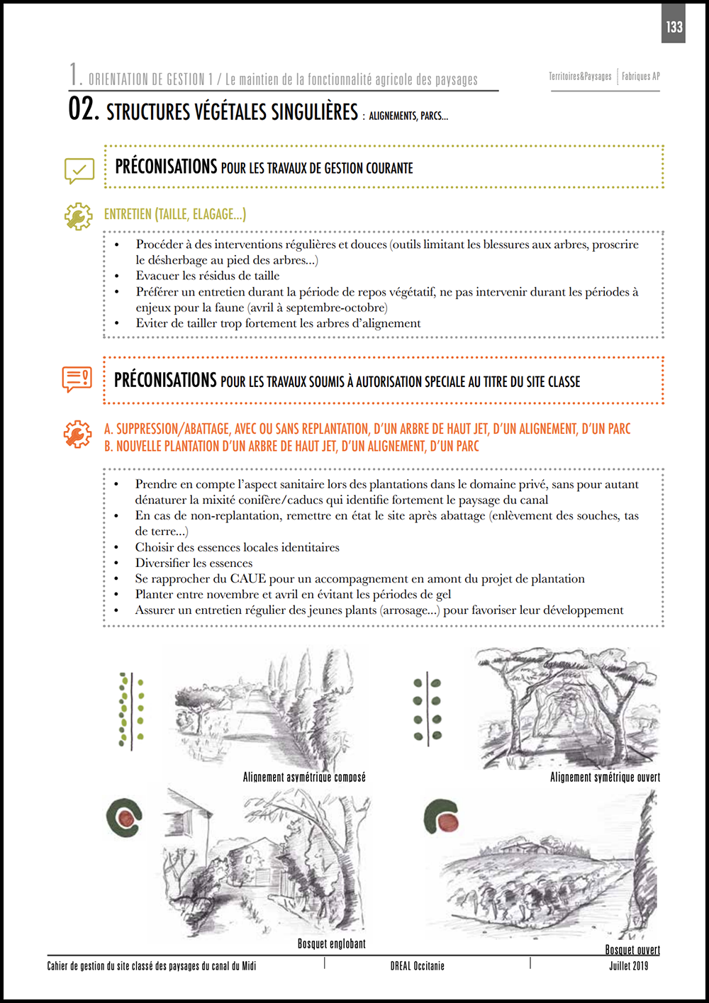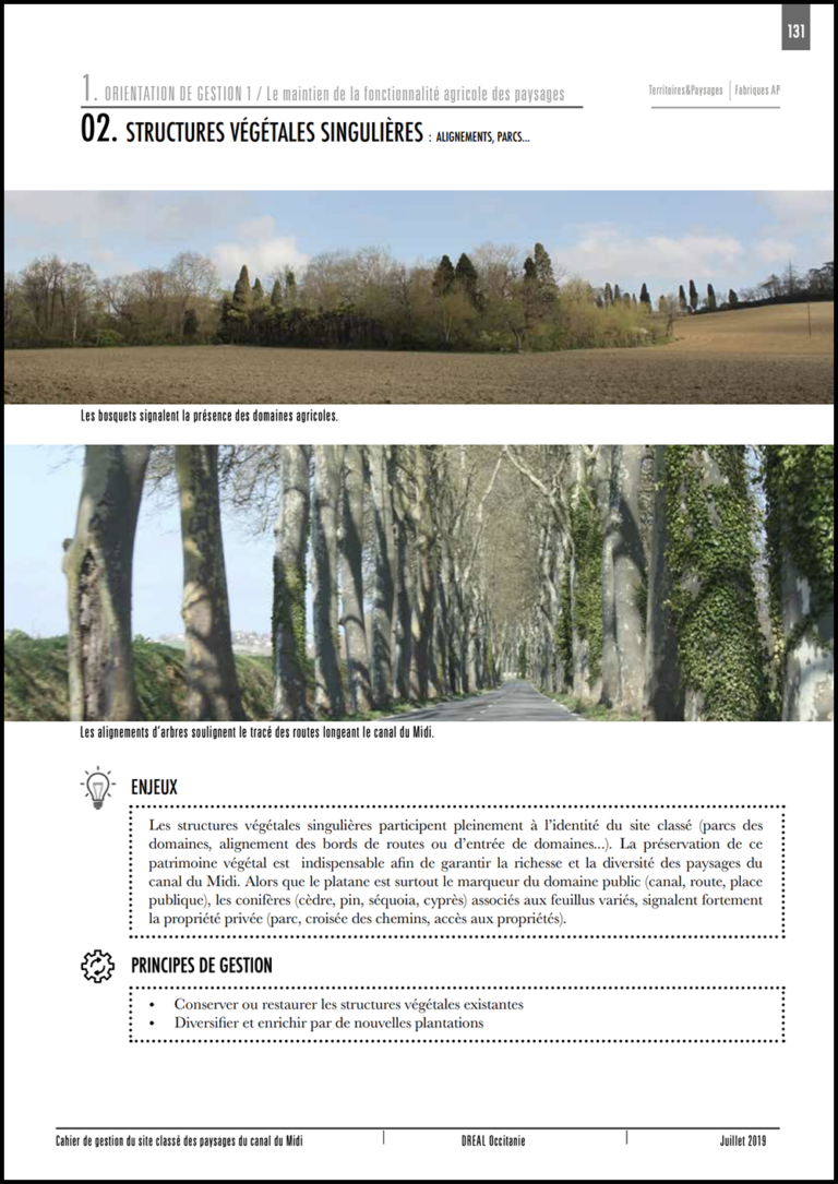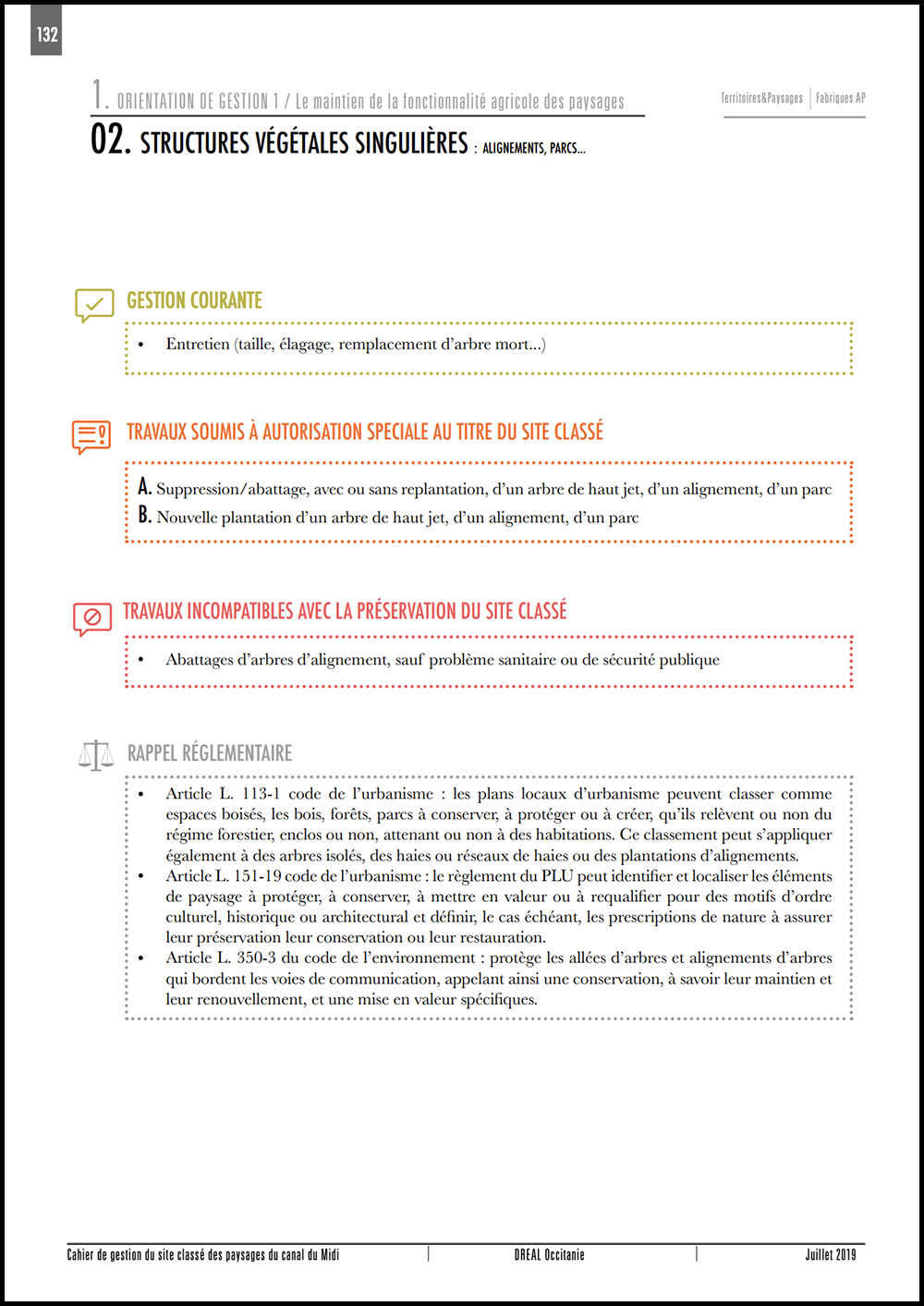 Pour aider et renseigner de façon concrète tous les porteurs de projet, publics ou privés, qui souhaitent réaliser des travaux au sein du site classé des Paysages du canal du Midi, un cahier de gestion est disponible depuis fin 2019. Il s’agit d’un document méthodologique qui pose des règles communes et partagées et qui vise à favoriser le partenariat et la mise en synergie des acteurs.