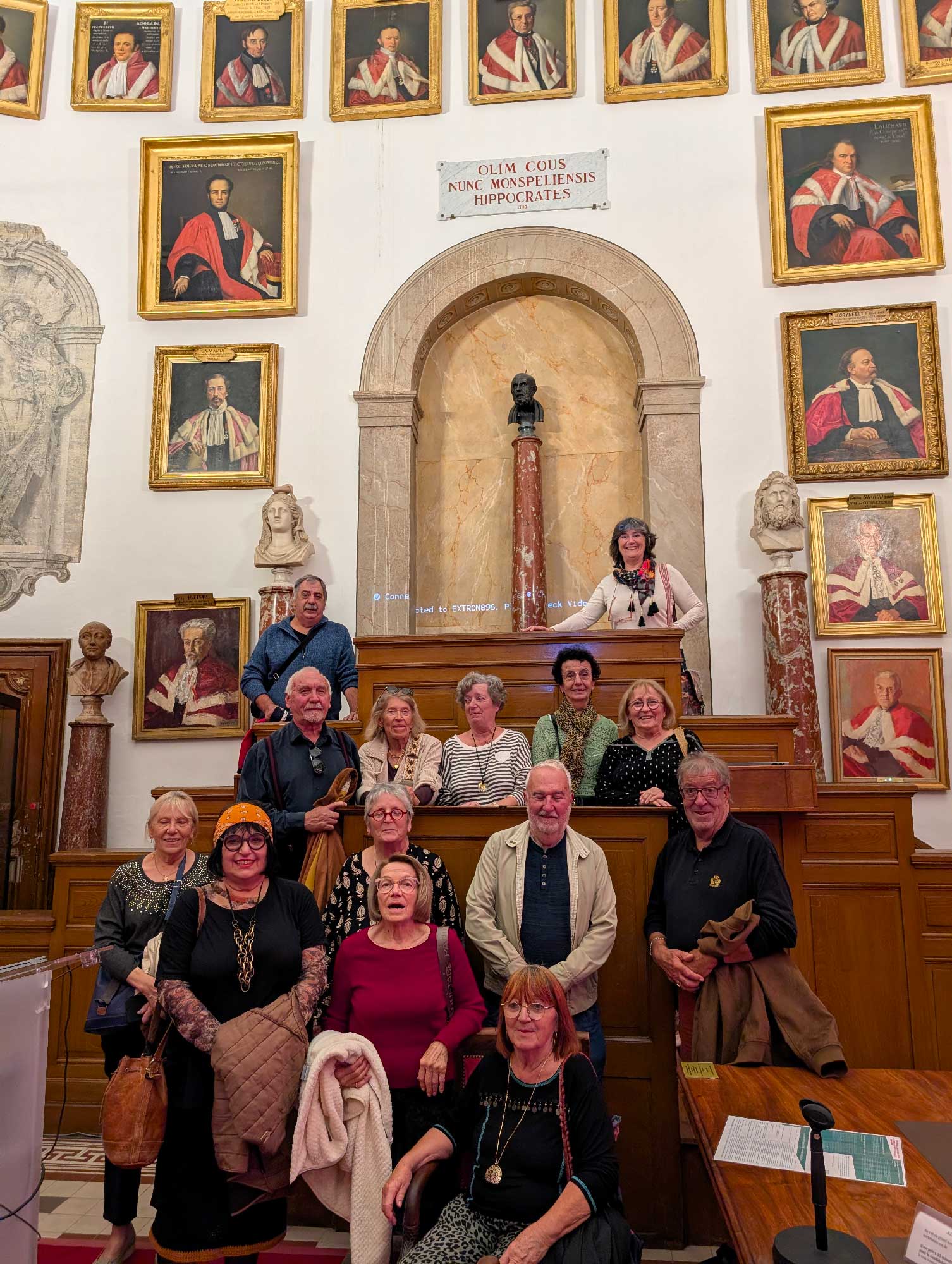 Suite à la demande d’autorisation accordée par l’Université, les visiteurs ont eu l’opportunité de visiter également l’amphithéâtre d’anatomie et la Salle des Actes, où les étudiants en médecine présentent leurs thèses de fin d’études et prêtent serment, entourés des portraits d’illustres prédécesseurs. Michel Bossy, appariteur, a nourri de précisions historiques la visite, en accompagnant les membres de l’association dans ces salles habituellement réservées aux étudiants, mais disponibles en cette période de congés universitaires.