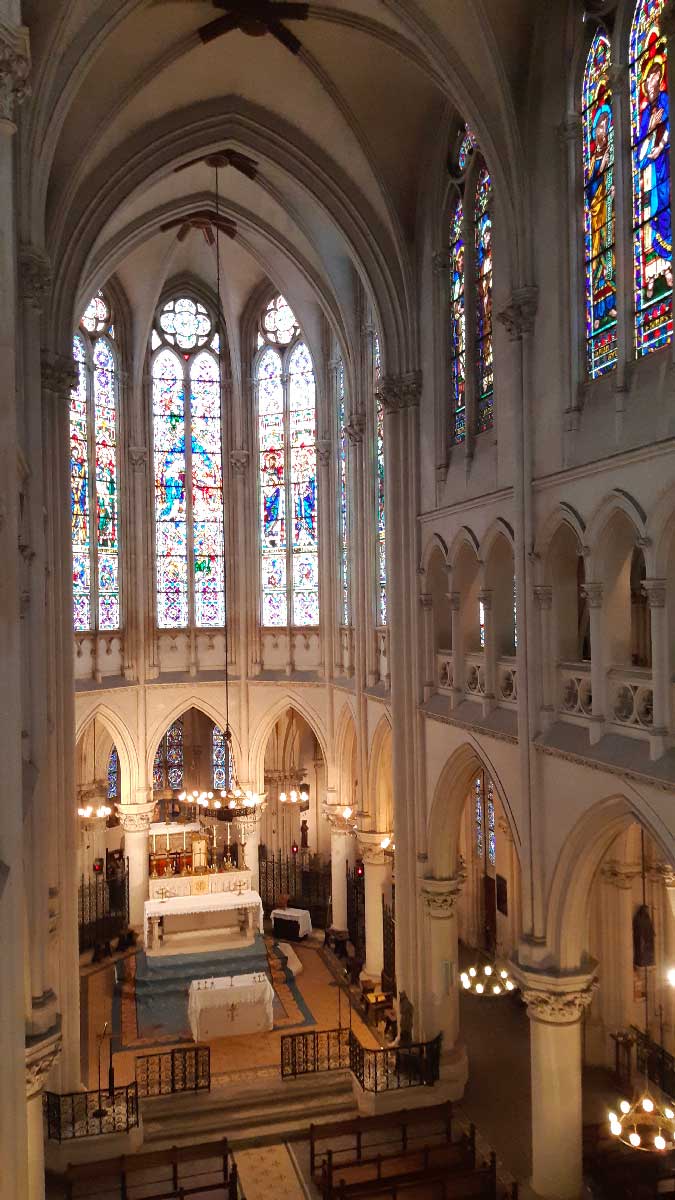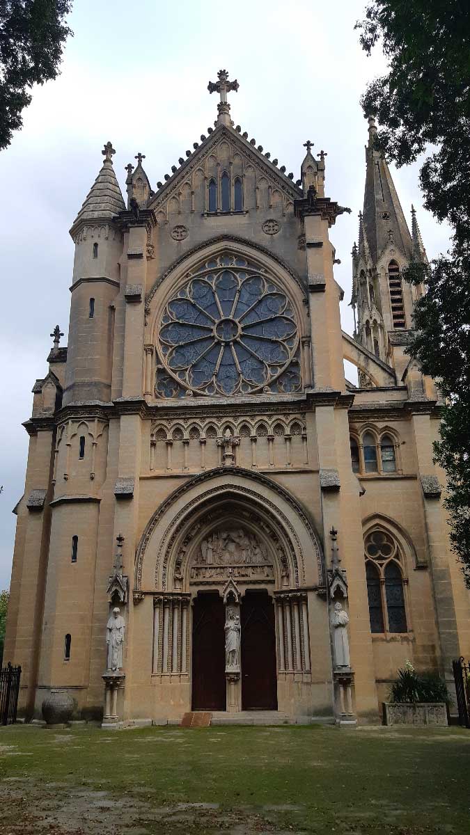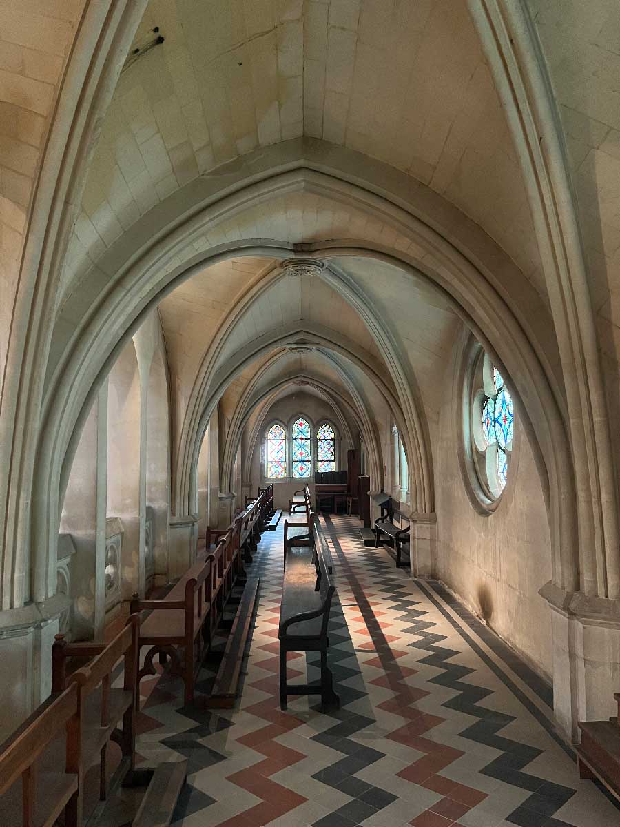 En 1909 toujours, il débuta la construction de la chapelle, qu’il voulut de style néogothique. L’architecte Julien BOUDES fut choisi pour concevoir le projet de cet édifice d’exception, qui fut consacré en 1913. (À noter que ce même architecte est également l’auteur de l’église Sainte-Thérèse de l’Enfant-Jésus (1932-1942, avenue d’Assas), de style mi-Art Déco et mi-néo-byzantin).