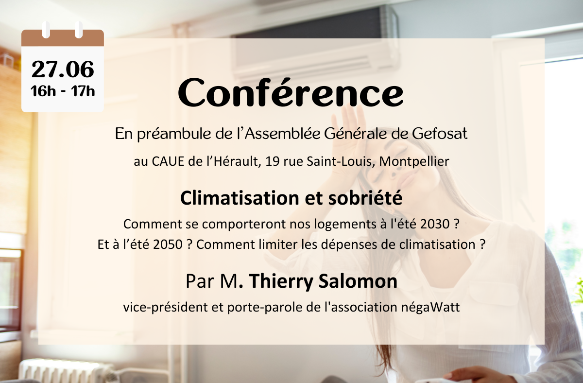 Comment se comporteront nos logements l’été en 2030 et 2050 ? Et comment limiter par simple sobriété les dépenses de climatisation ? Jeudi 27 juin 2024, à partir de 16h, en préambule à son Assemblée Générale qui se tiendra au CAUE de l’Hérault, l’association Gefosat vous invite à une conférence, où Thierry SALOMON, vice-président et porte-parole de l’association négaWatt, abordera ces questions. Durée : 45 min – 1 h.