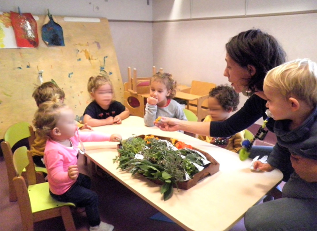 Petit atelier d’éveil sensoriel sur la thématique des plantes comestibles et aromatiques avec les enfants de la crèche “À petits pas”, à Aspiran. Une approche du végétal pour susciter un intérêt chez les tous petits : couleurs, odeurs, saveurs, textures…